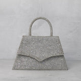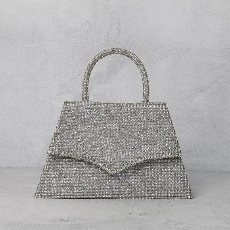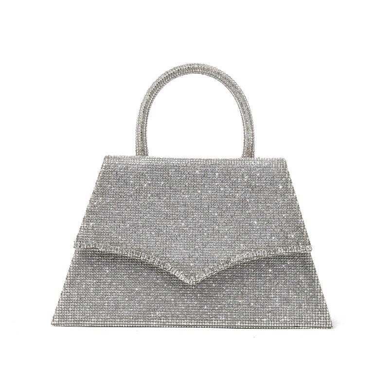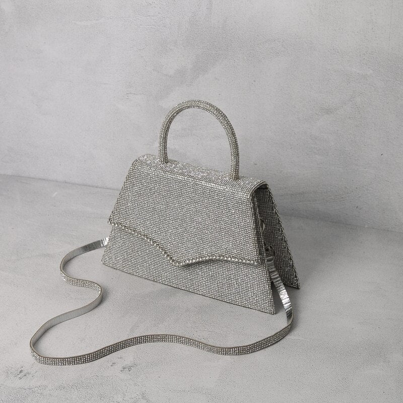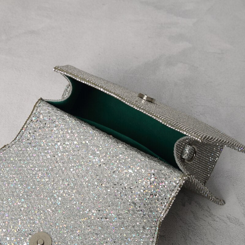 The Maison's dark elegance is the key feature of this genuine calfskin small clutch with rotating metal closure on the top. It has a detachable leather shoulder strap. The inside is fully lined and features a mirror and a ""You look great today"" embroidery. Fully emcrusted with swarovski stones. Measures: h cm 23, w cm 7.5, d cm 15.5.