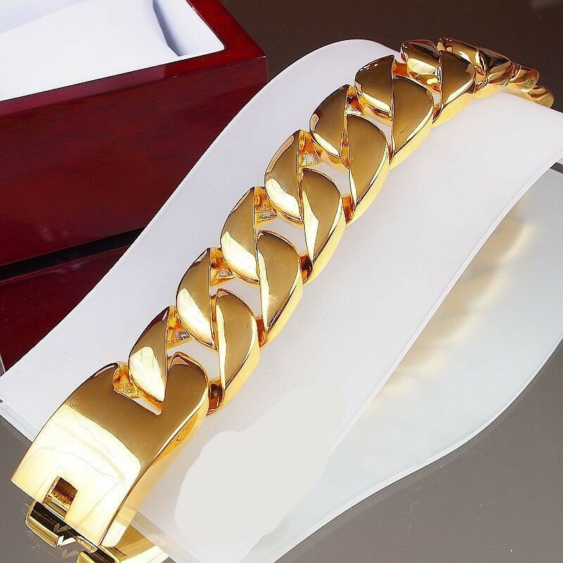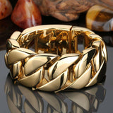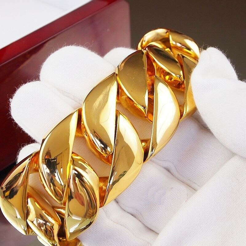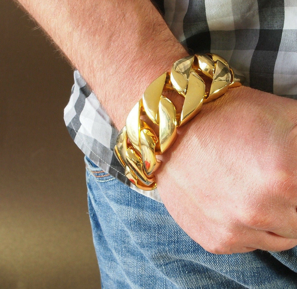 Just Released! The Most Realistic Gold Cuban Chain Available. This Solid Stainless Steel Chain is IP Gold wrapped THREE times for complete gold coverage all over, even between the links. The Gold wrapping is very thick which gives it a complete solid gold look and heavyweight feel. This Gold Miami Cuban Chain features a triple lock clasp, to keep this beautiful chain secure on your wrist. This is the best you can get without spending thousands on a solid 14K gold Miami Cuban Chain. Measures 31 mm in width and choose your chain length from our menu. Order your best quality Gold Miami Cuban Chain from us today as these are selling fast!
