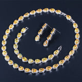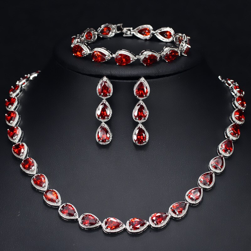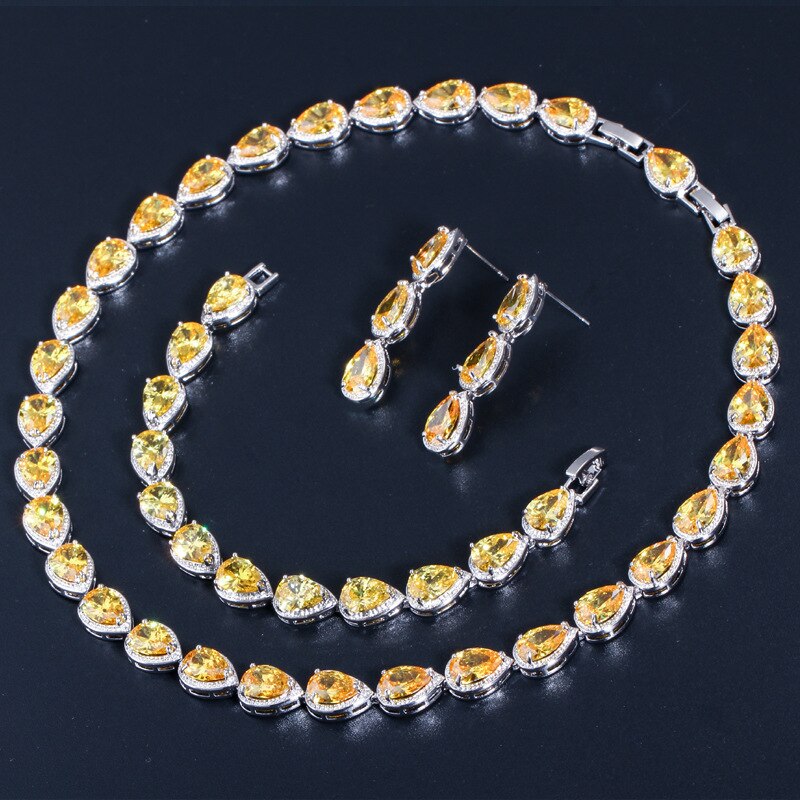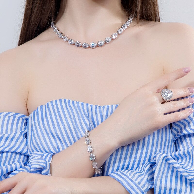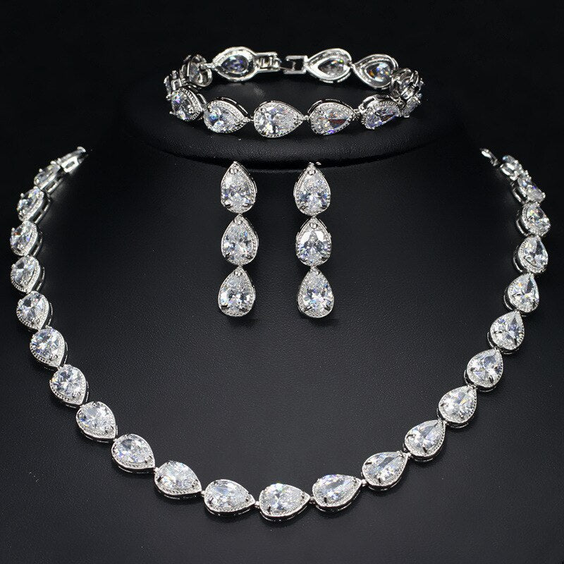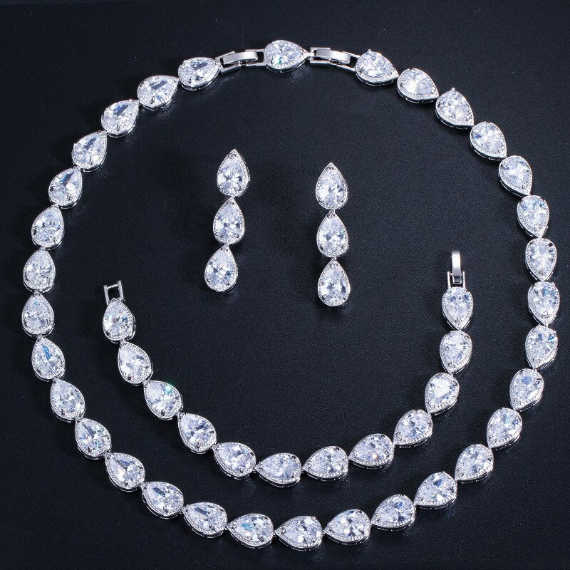 Elegant drop down earrings, necklace and bracelet with amazing shine. These stunning drop down earrings feature graduating stones and ends in a brilliant cut stone. They are made out of genuine 925 sterling silver, finished with a layer of rhodium to reduce tarnishing and give it the deep shine of white gold jewelry.