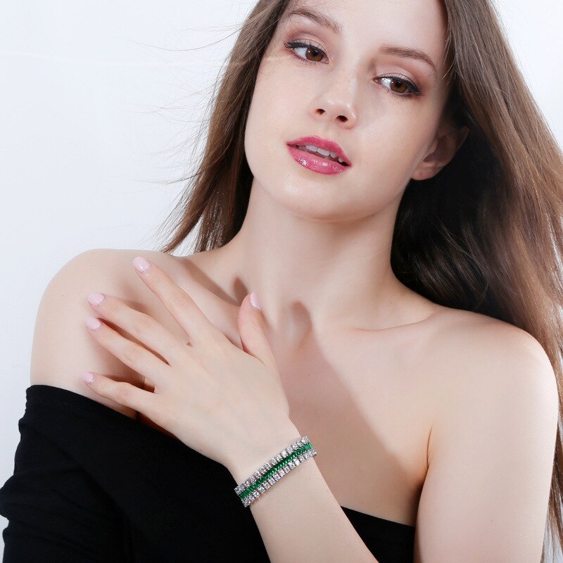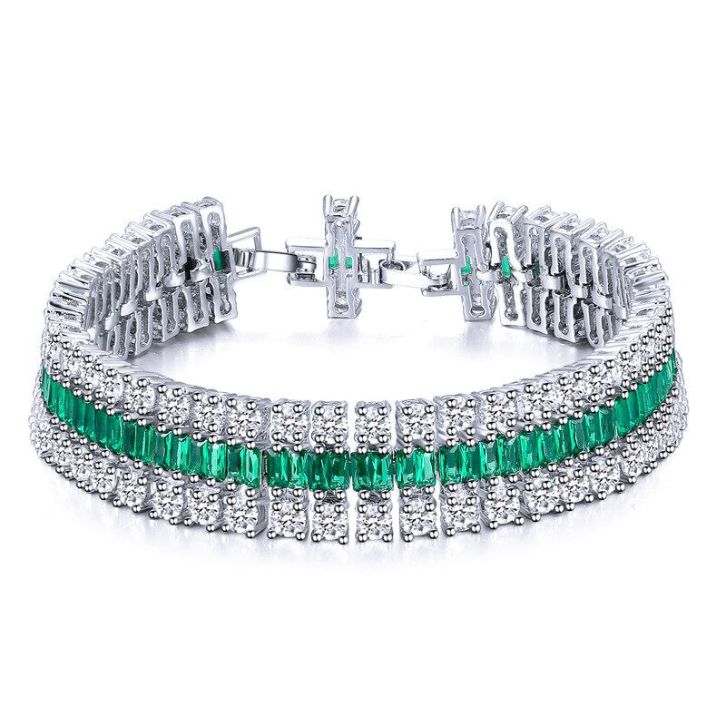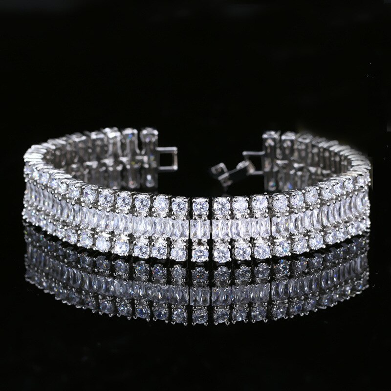 Wow is likely the first word that comes to mind. This beautiful bracelet has 195 of our 5A flawless moissonite stones, prong set for a modern look. The shine and sparkle of this piece is truly a sight to beyond. It has the look of a 5 figure bracelet easily. This sterling silver bracelet is finished in rhodium and features our signature easy-lock clasp.