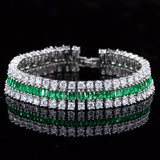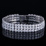 Wow is likely the first word that comes to mind. This beautiful bracelet has 195 of our 5A flawless moissonite stones, prong set for a modern look. The shine and sparkle of this piece is truly a sight to beyond. It has the look of a 5 figure bracelet easily. This sterling silver bracelet is finished in rhodium and features our signature easy-lock clasp.
