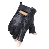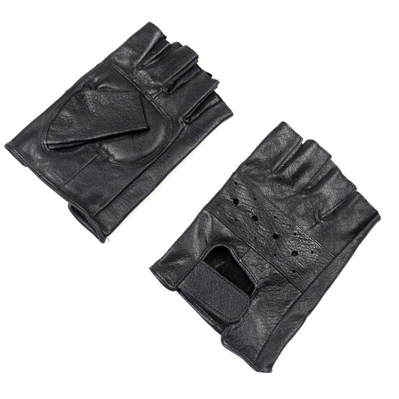 Driving fingerless Leather gloves with a contrasting leather patch featuring the brand's lettering. Inner lining.