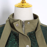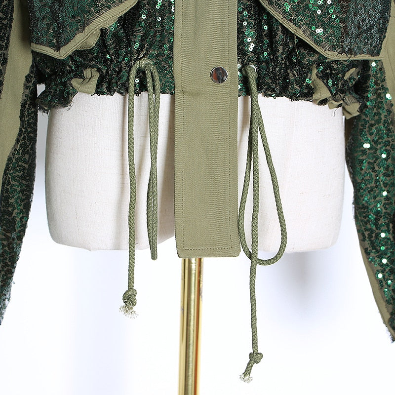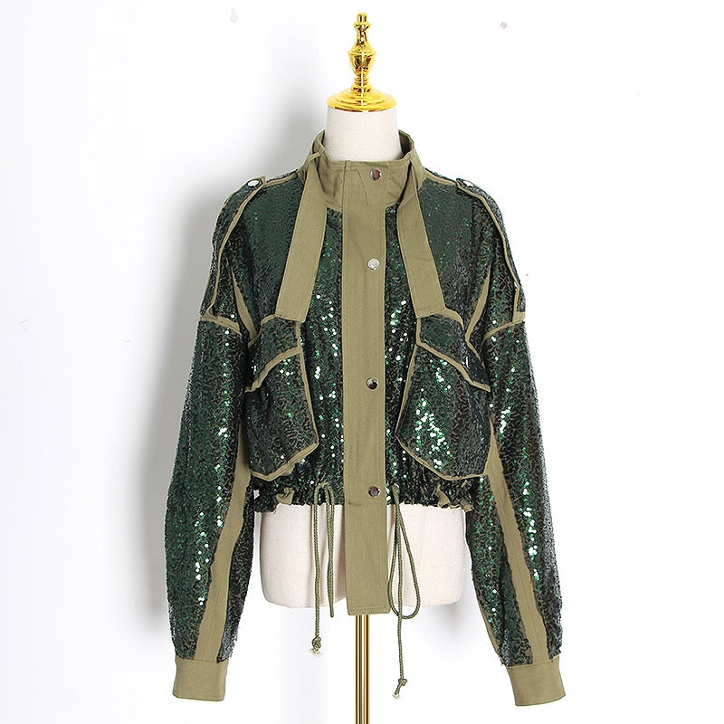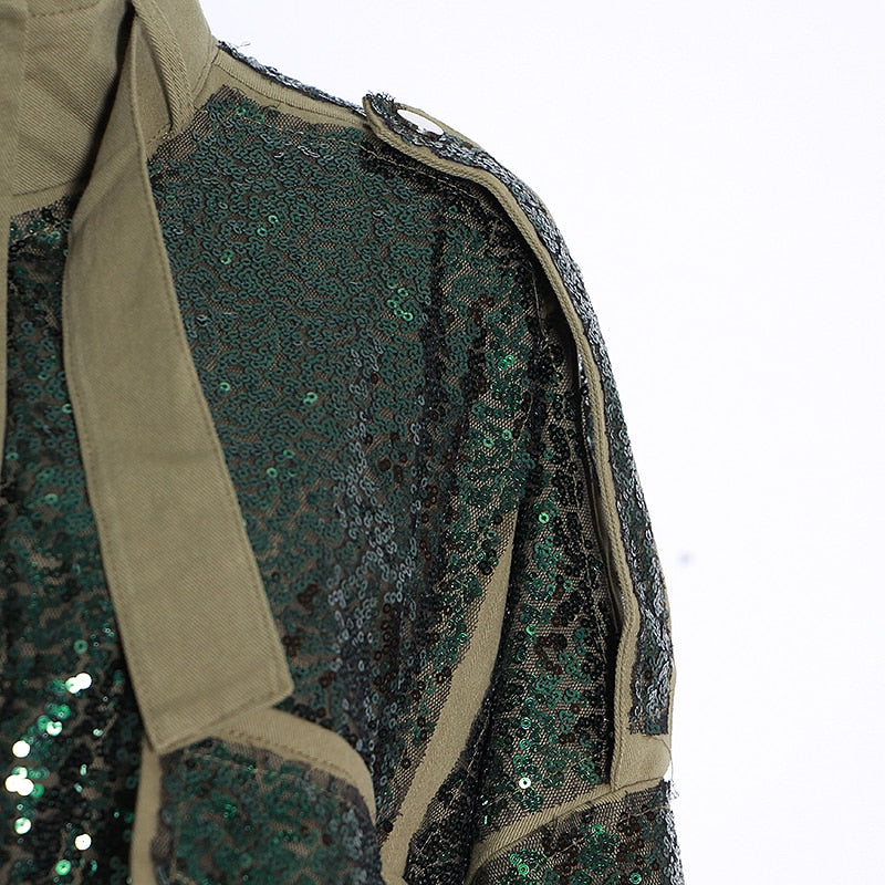 Loose-fit sequin single button line jacket. A badge with the logo is sewn at left chest. Overt buttoning. Two flap pockets. Sequin enriched throughout. Inner lining.