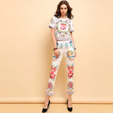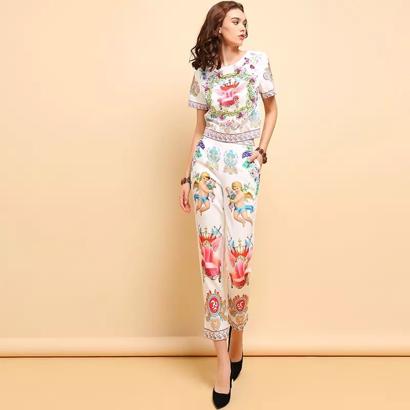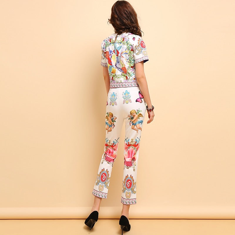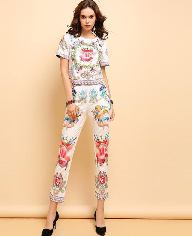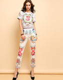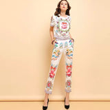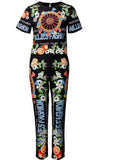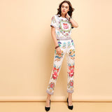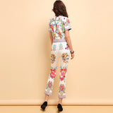 Cotton short sleeve jumpsuit. Banded waist. Two needle stitching. Floreal embroideries thoughout the 2 pieces set.
