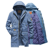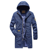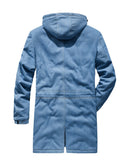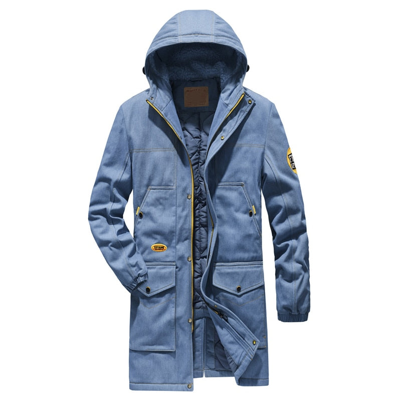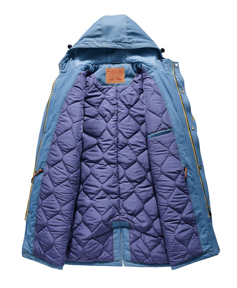 This shiny denim hooded long jacket was designed to take a turn on the tradition. Detachable hood. Zipper fastening. Two zip-up pockets and centre slit at back. A special lettering at left chest. Elastic cuffs. Inner lining.