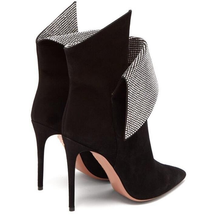 Rock vibes for these crystal-covered frontal band suede booties. Zip-up fastening on the side. Jewel skull skewered in the iron stiletto. Nappa footbed. Genuine leather sole. Heel: 40 mm.