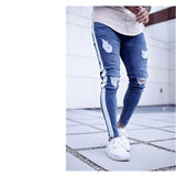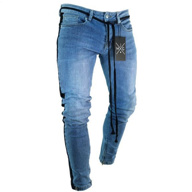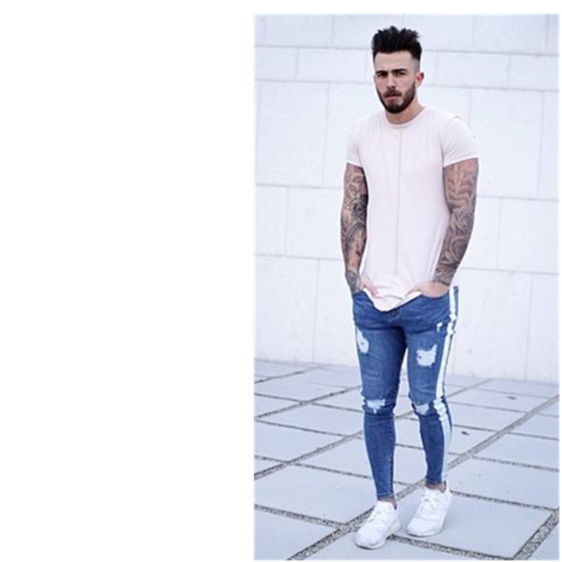 Wear-and-tear and scratches are the main feature of these stone washed stretch denim 5 pocket pants. The sporty inspiration is highlighted by the side featuring the stright lines. A stripe with the brand’s lettering is printed on the left leg and ribbed fabric inserts are sewn on the knees. Cotton ribbed waistband with drawstring. A leather badge with the brand's hexagonal logo on the right rear pocket. Cotton ribbed bottom cuffs. Two needle stitching. Fit: Slim fit.