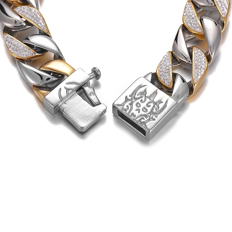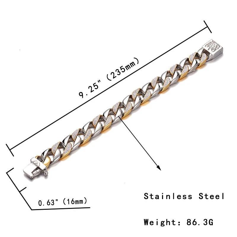 The Most Realistic Stainless Steel Cuban Bracelet Available. This Solid Stainless Steel Bracelet is IP Gold wrapped THREE times for thick gold coverage all over, even between the links. The Gold wrapping is very thick which gives it a complete, long lasting, solid gold look and heavyweight feel. This Gold Miami Cuban Bracelet features a triple lock clasp, to keep this beautiful bracelet secure on your wrist This is the best you can get without spending thousands on a solid 14K gold Miami Cuban Bracelet. This Gold Cuban Bracelet offers different measures in width. Order your best quality Gold Miami Cuban Bracelet today as these are selling fast!