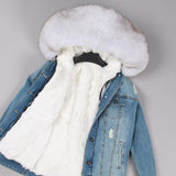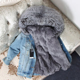 This oversize version of the classic stone washed denim jacket, thanks to metal stud and crystal decorations, celebrates this season's theme: Far West. Fox fur trimming on the opening and lining the collar. Two slit pockets and two patch ones with flap. Hook fastening. Inner lining.p>