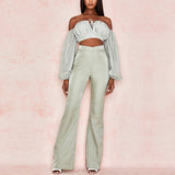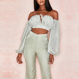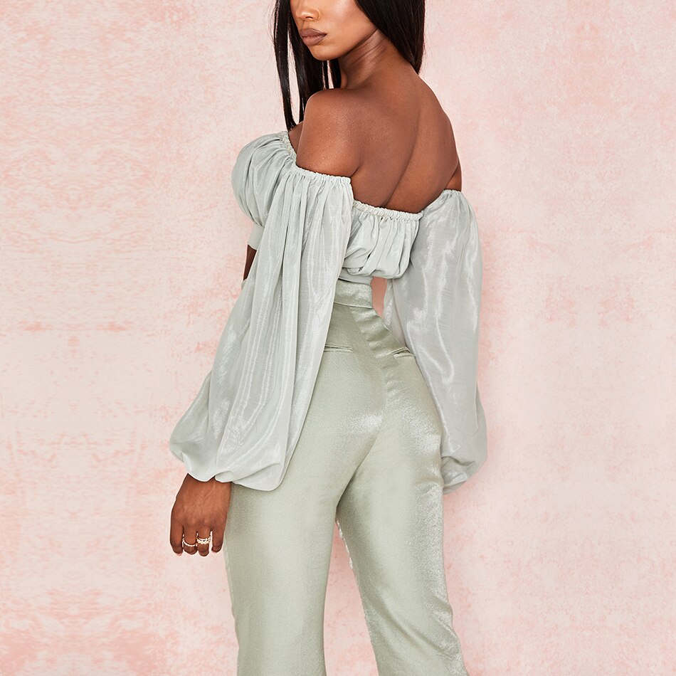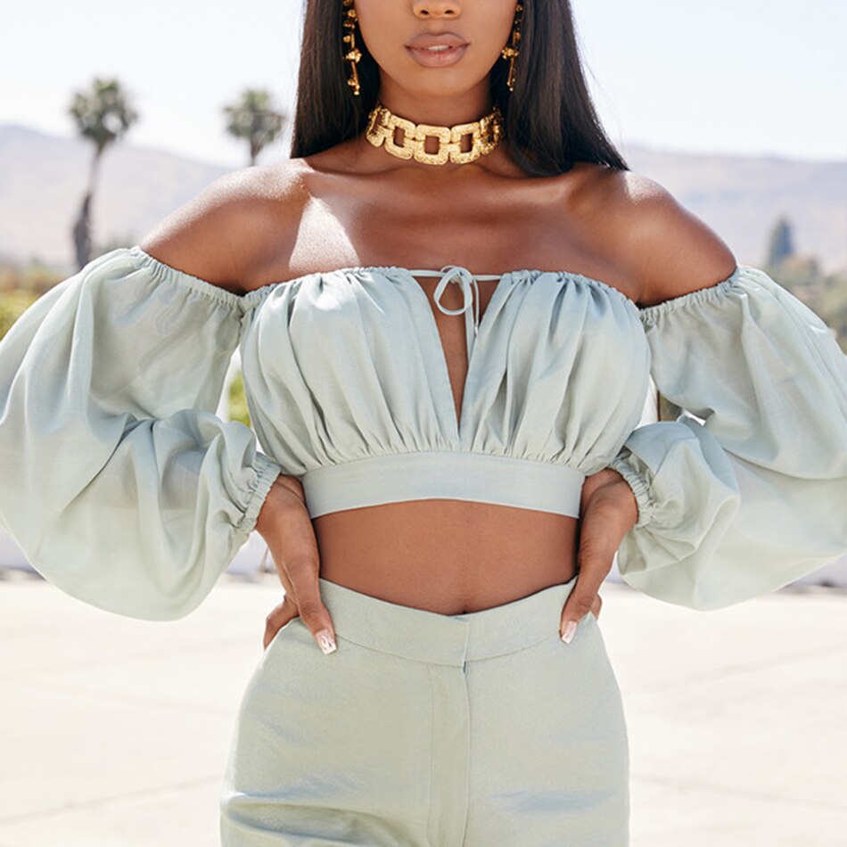 Hollywood divas’ glamour is back on this sexy and elegant jersey and viscose cady jumpsuit. Plunge neckline and full-cut trousers. long and puffy sleeves.
