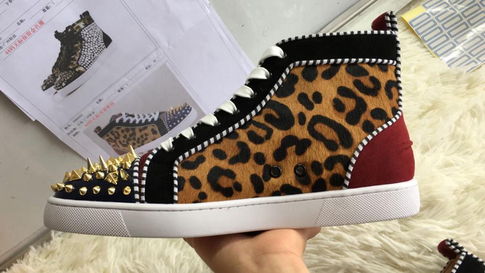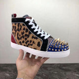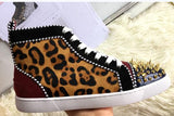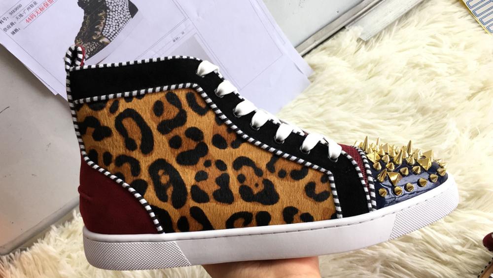 Genuine Nappa leather hi-top sneakers. Multifaceted metal plate placed at the external side. Metal golden spikes added at the front. Padded ankle covered by suede. Rubber sole. Nappa lining.