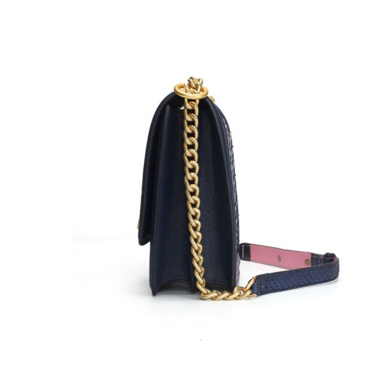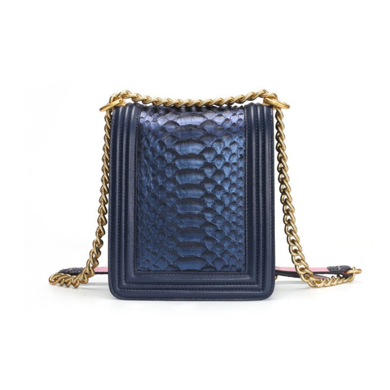Python leather and genuine calf leather shoulder bag. Flap placed at the front. Outside zipped pocket. Inside pocket with zip. Adjustable padded leather shoulder straps. Back covered by mesh. Carry handle. Fully lined. Measures: h 28cm, w 20cm, d 10 cm