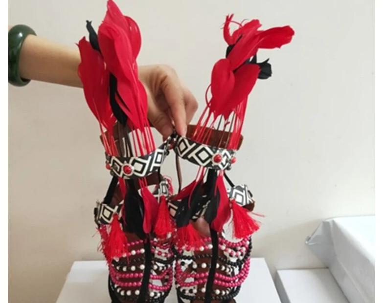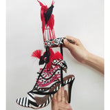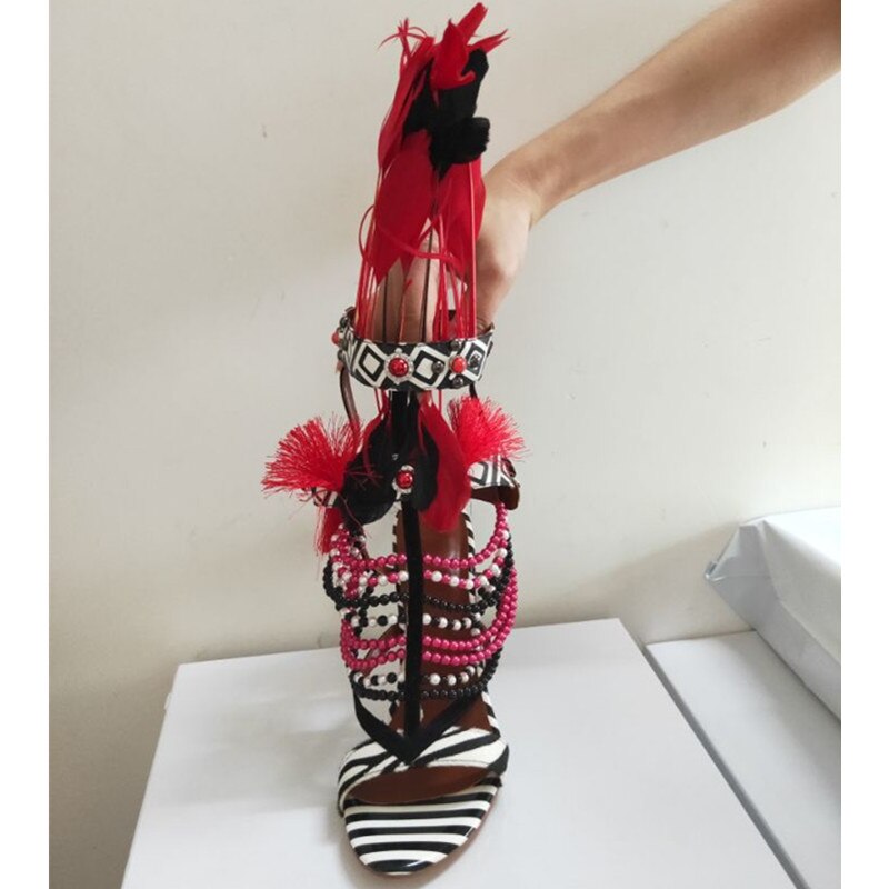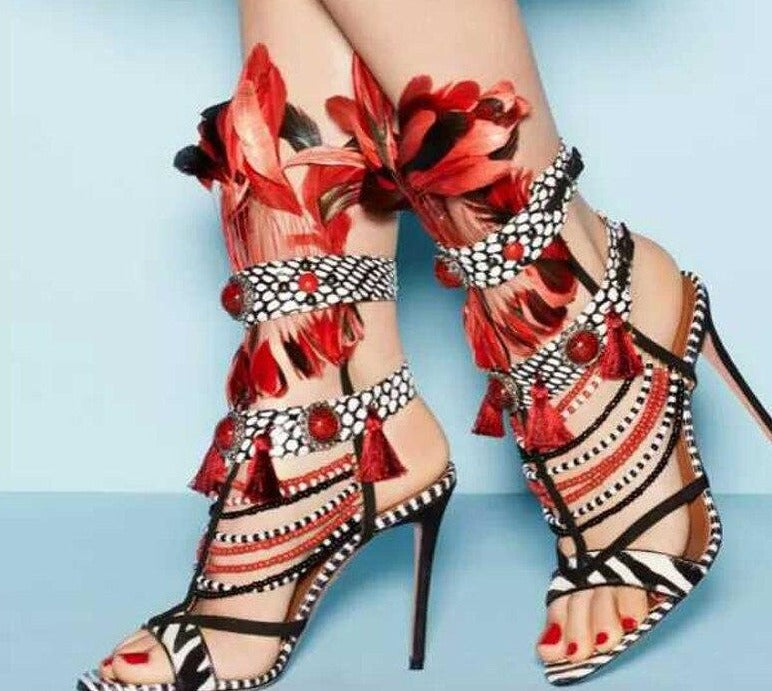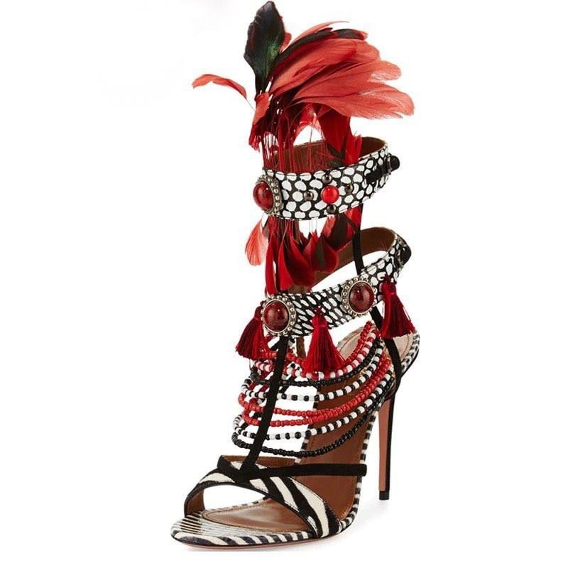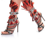 A classic but stylish crystal studded reinterpretation of a classic gladiator sandal. Revised design by the Pisani Maison featuring a removable 8” fanned out feather. Vivid and ever changing tonality of colour define this unique piece. Lined iron stiletto. Inner lining. Genuine leather sole. Heel: 100 mm.