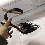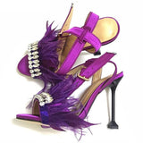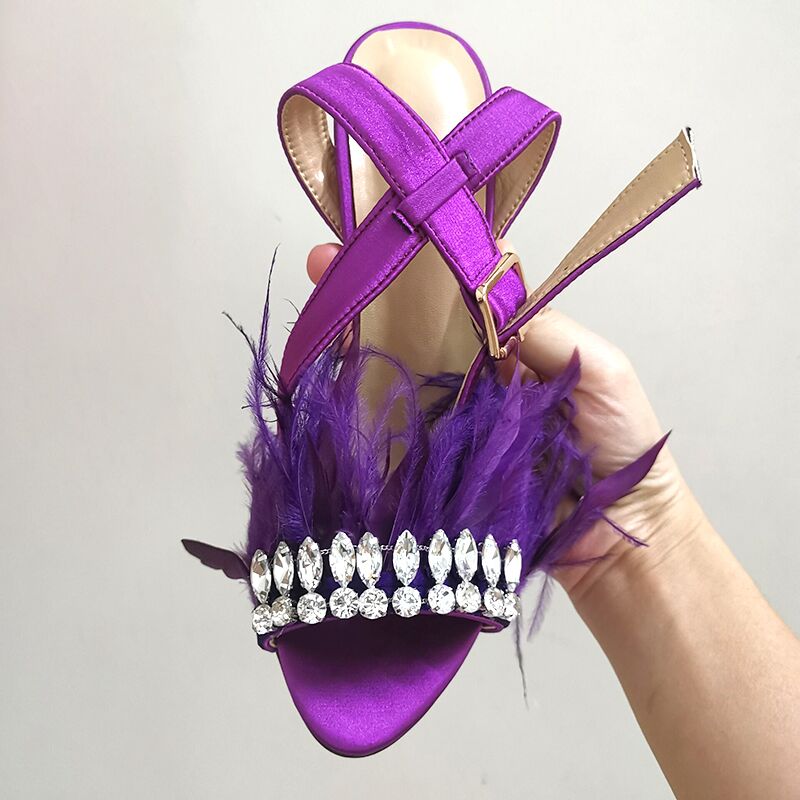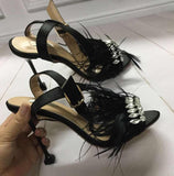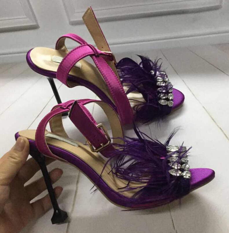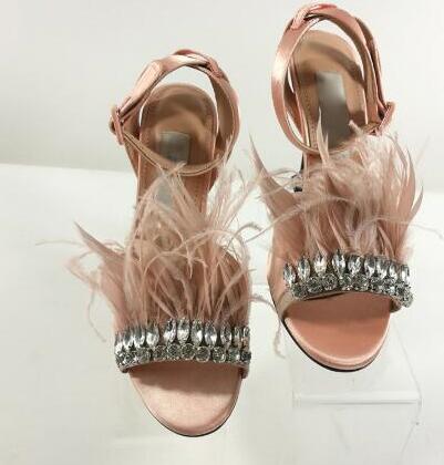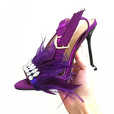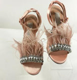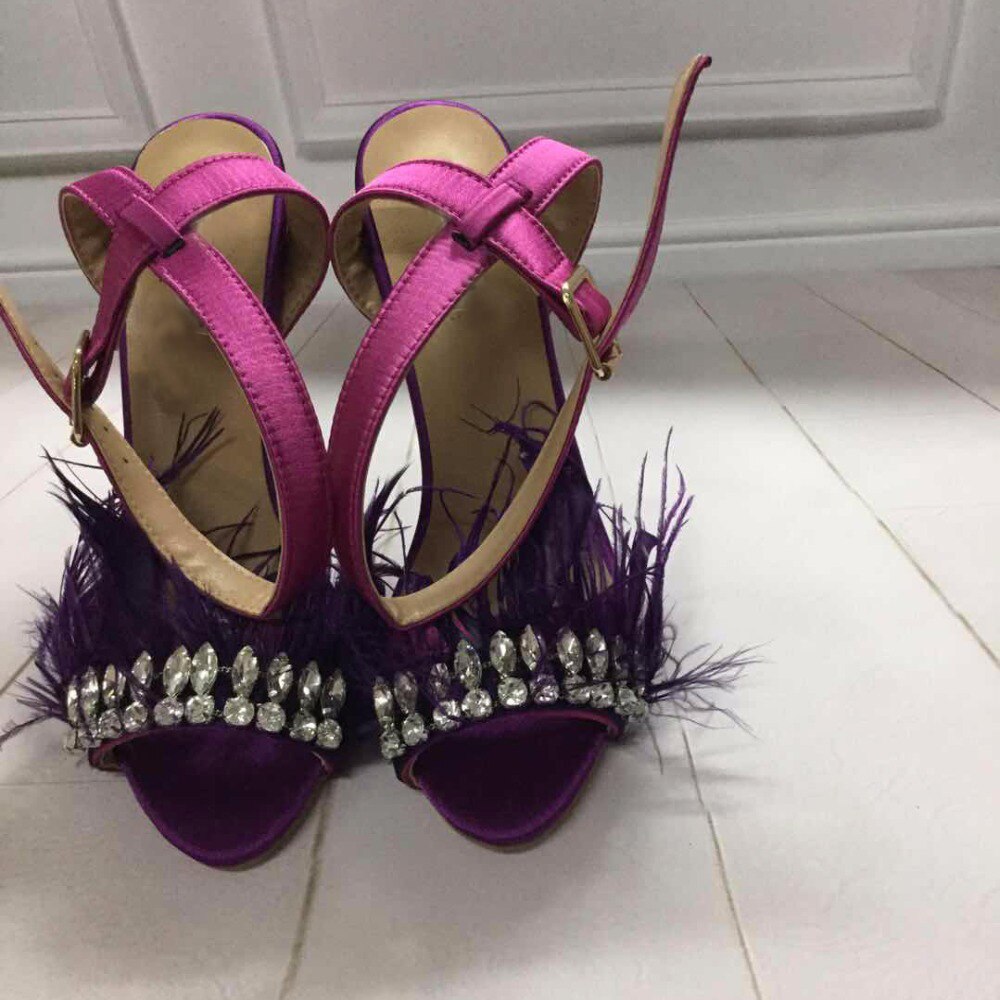 You'll need these Swarovski crystal covered suede pumps for your red carpets.Feathers adhorn the toe band. Leather metal buckle ankle strap. Iron stiletto with larger base. Inner lining. Genuine leather sole. Heel: 120 mm.