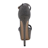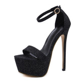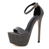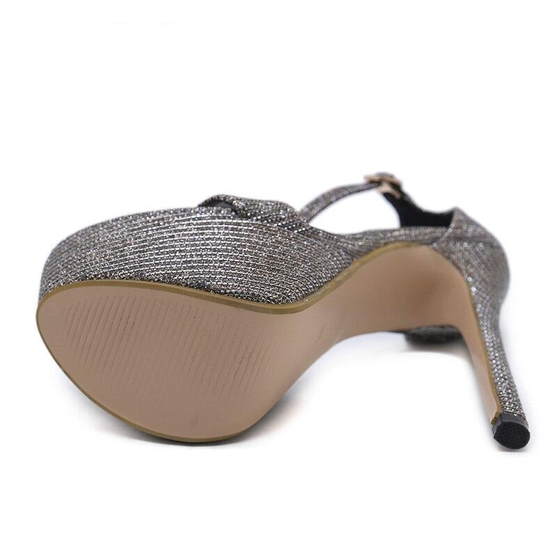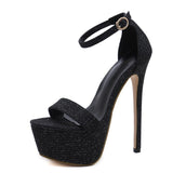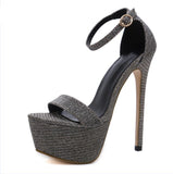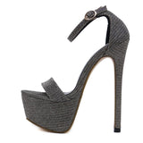 Satin and suede platform sandals with stiletto heels and platform. Patent leather footbed and sole. Crossing straps and buckle ankle strap. Platform: 40 mm. Heel: 140 mm.