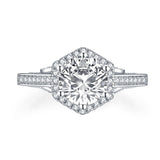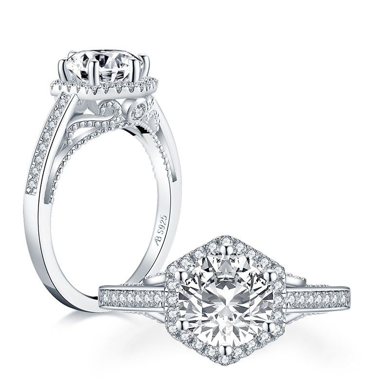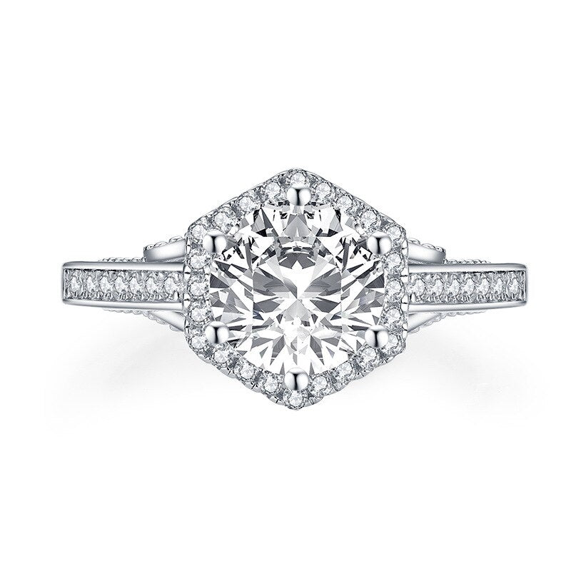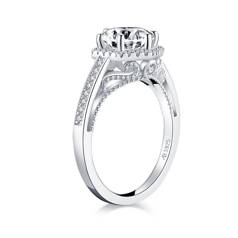 A fabulous 2.5 carat round cut stone is mounted on a low profile halo setting. Absolute perfection! This ring features a large 2.5 carat flawless cushion cut stone. It is 5A CZ, producing an absolutely stunning shine with beautifully cut facets. The center stone is surrounded with a Signity CZ halo. This ring is hand made out of 925 sterling silver, finished in rhodium. The rhodium coat prevents tarnish and gives the ring the exact look and feel of white gold jewelry.
