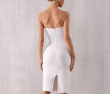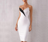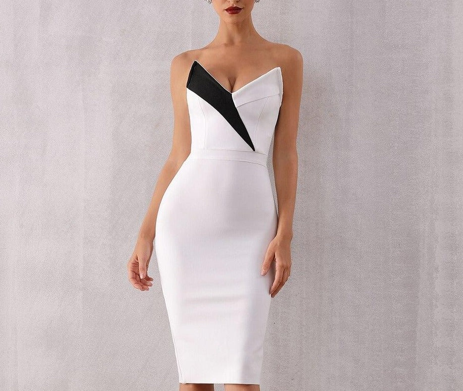 This Roma stitch, strapless sheath dress is decorated all-over one side with a distinctive oppoding coloured fabric. Zipper fastening at centre back.