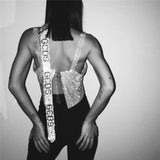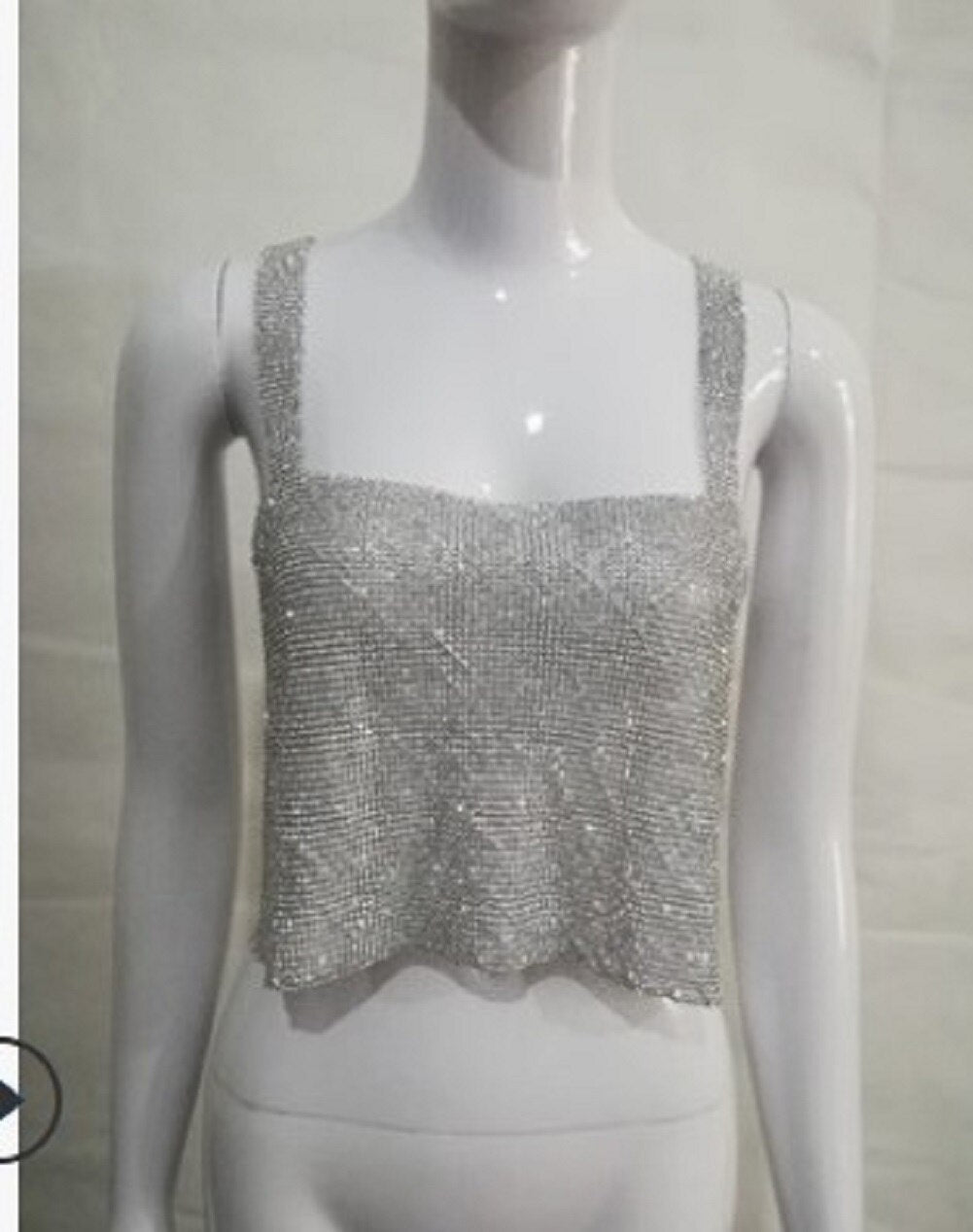 The iconography of Maison Pisani is identified by its lettering designed, futuristic materials or widespread use of swarovski in new and original versions every new season. This swarovski jersey rower tank top encrusted with more than 50000 stones, features a fastening lace on the back. Woven ribbed hems. Two-needle stitching bottom hem.