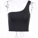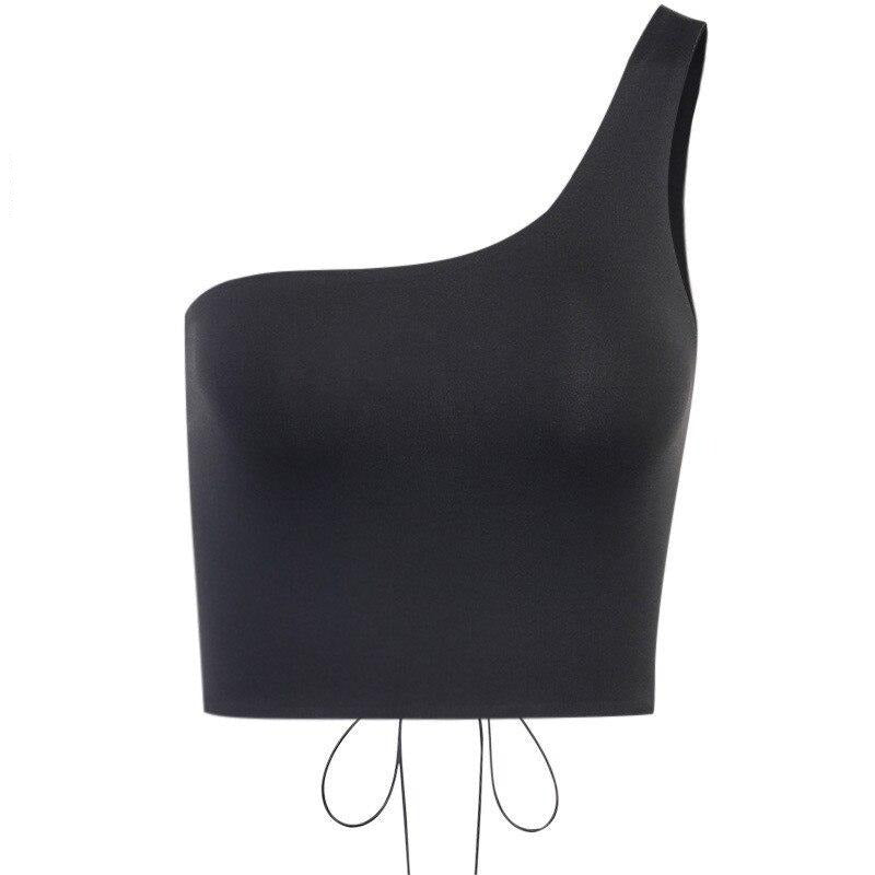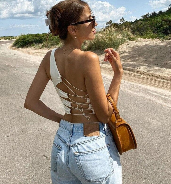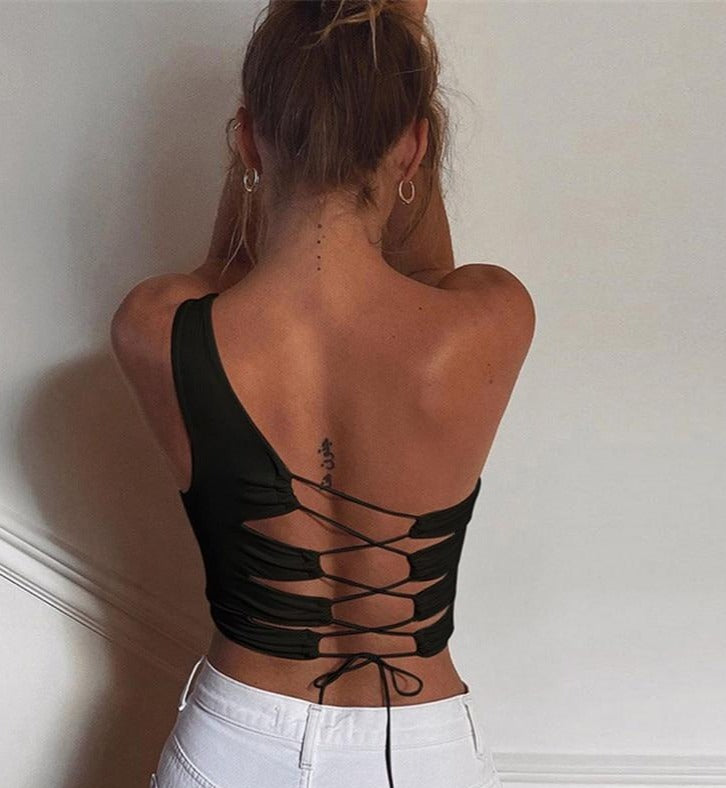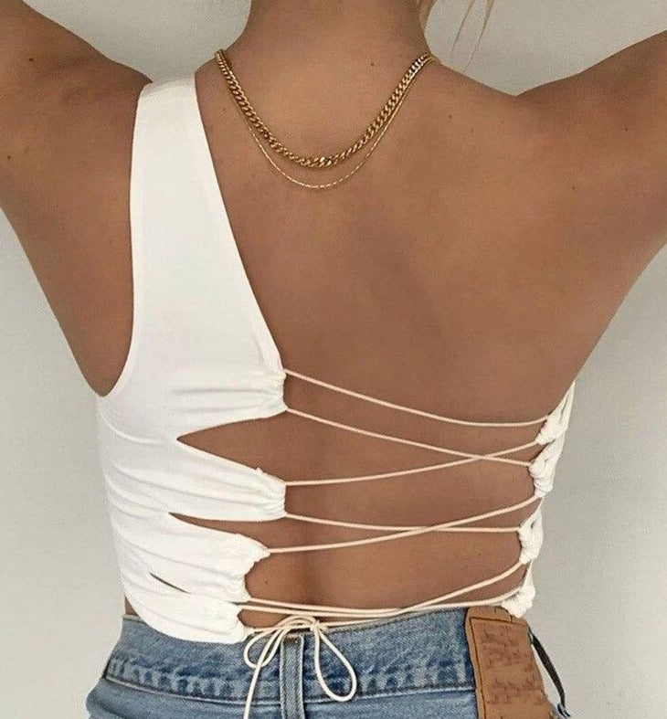 Pisani Maura created Pornografitti, a special capsule collection to demonstrate that this "romantic" item could reveal a very "aggressive" side. Satin long one shoulder top. Asymmetrical plunging neckline. Bare back interrupted by a slave interlaced closure style.