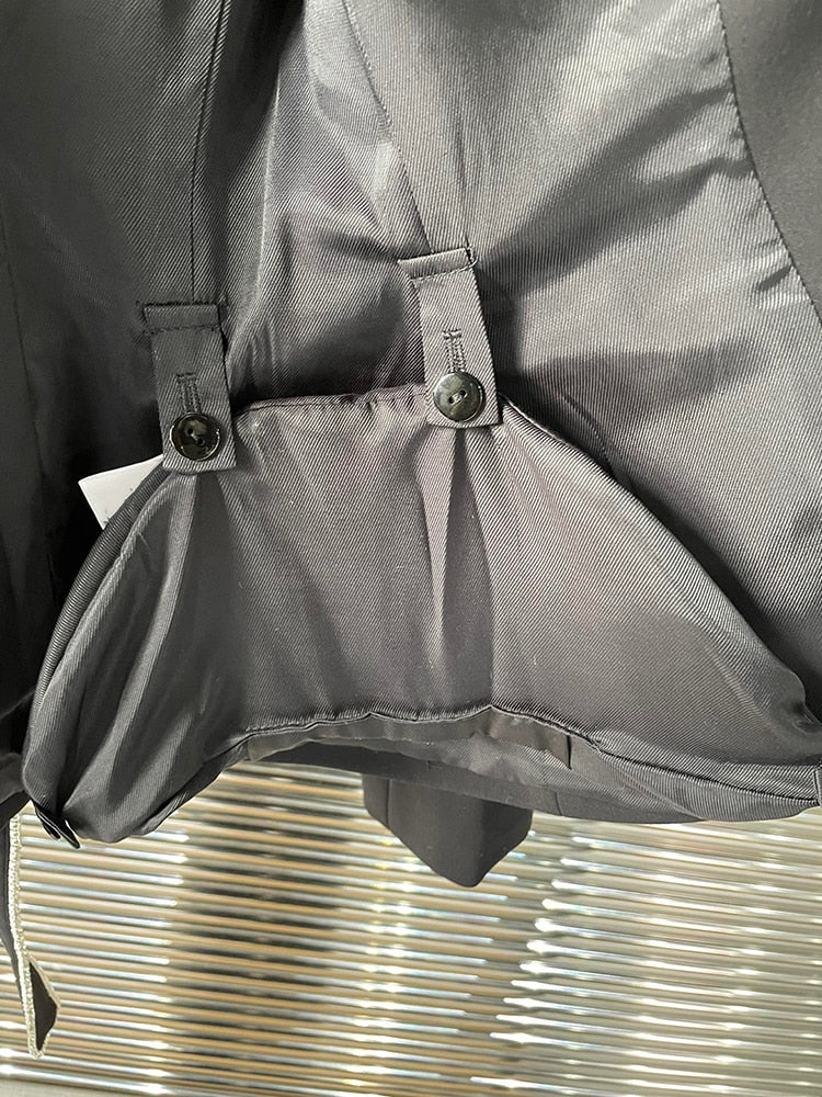 FABRIC #1: 54% POLYESTER 44% WOOL 2% ELASTANE | LINING #1: 100% VISCOSE | INSERT #1: 100% ZINC (ZAMAK?) | INSERT #2: 100% ACRYLONITRILE BUTADIENE STYRENE (ABS)