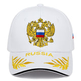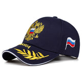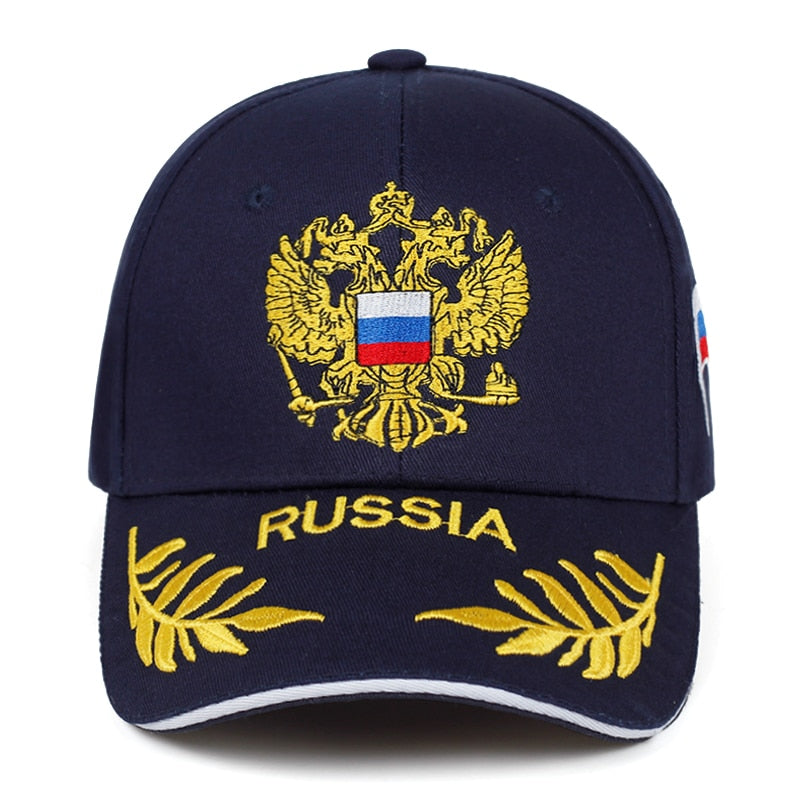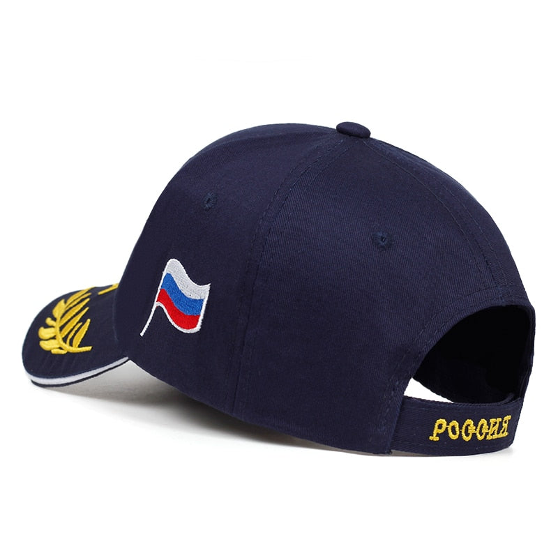 Cotton gabardine baseball cap with Russian Emblem embroidered on the front. Velcro adjusting strap. Unlined.