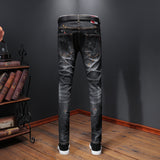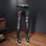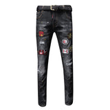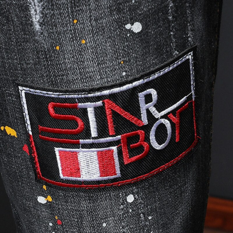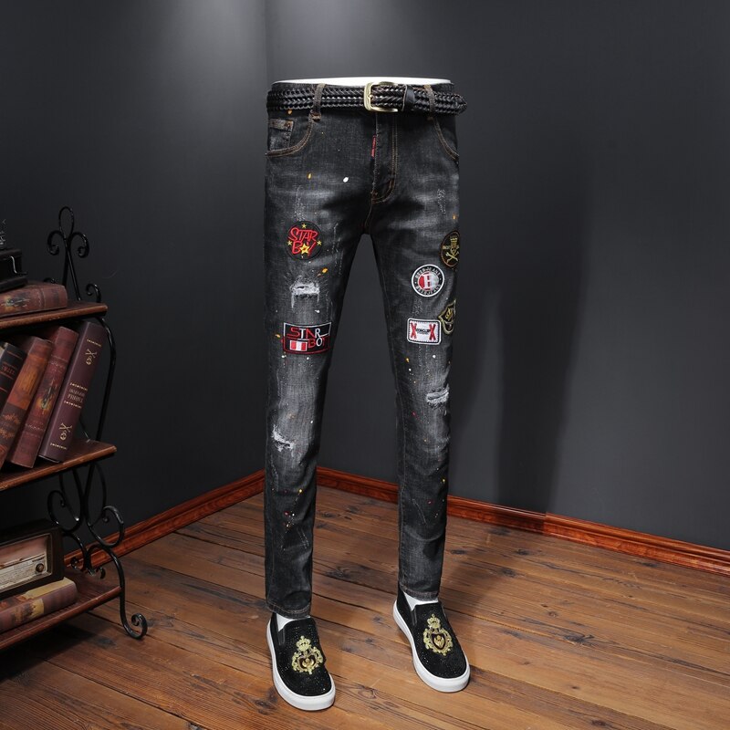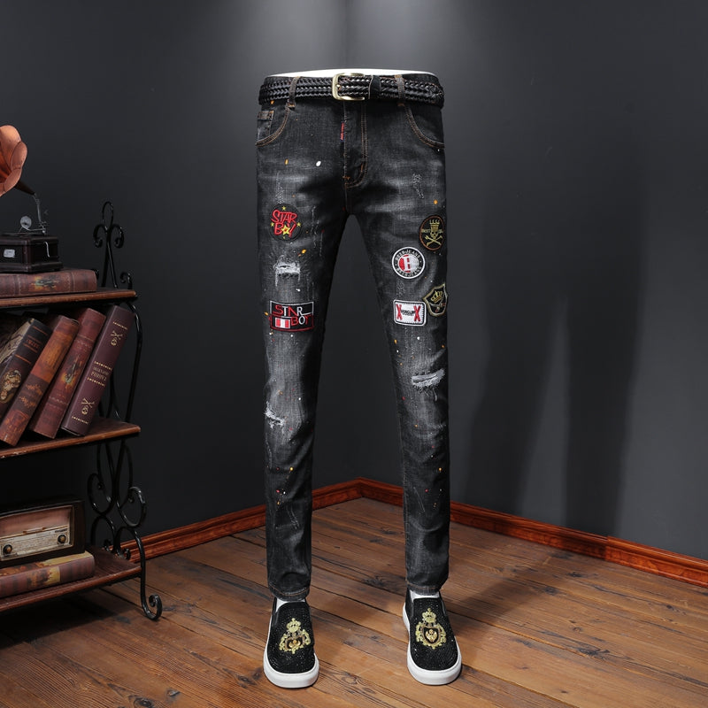 Scratches and rips are the main feature of these stone washed denim 6 pocket pants. Patches with the brand’s lettering embroidery and decorated with studs are sewn on the left leg. Metal buttons fastening. The Maison’s lettering is embroidered under the rear waistband. Two needle stitching. Fit: Straight.