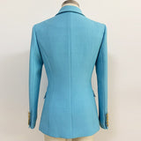The classic and simple lines of this viscose blend sand cady double-breasted jacket are overturned by retro details. Double-breasted blazer. Tight-fit, the concave shoulders and the large peak lapel remind of Bianca Jagger’s 70’s style. Metal jewel buttons fastening. Two flap pockets. Jungle-print lining.