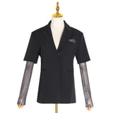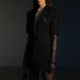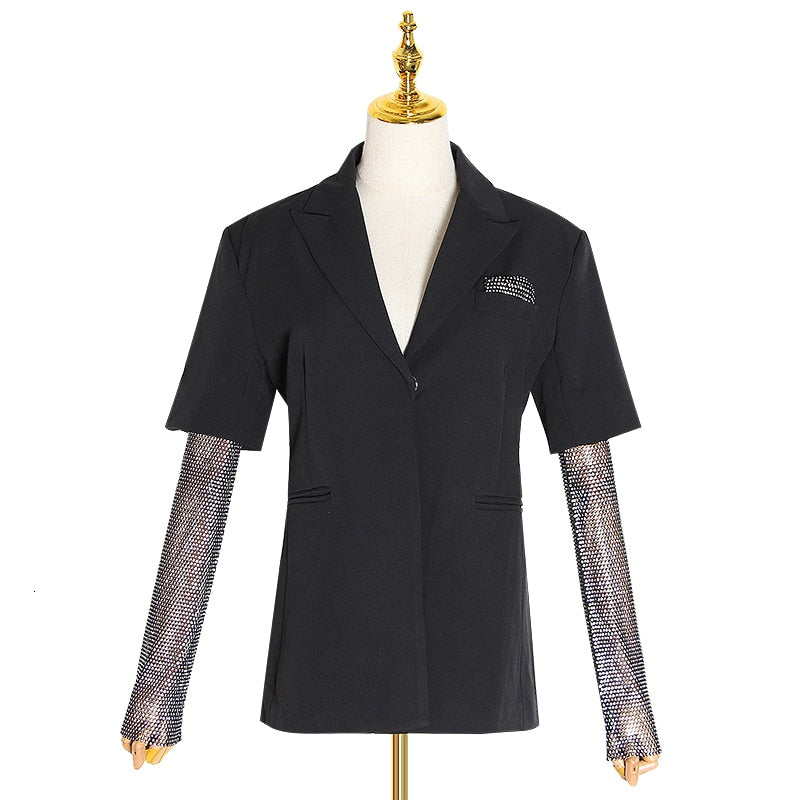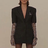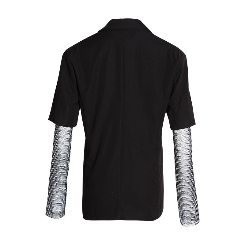 The classic and simple lines of this viscose blend sand cady single-breasted jacket are overturned by retro details. single-breasted blazer. Tight-fit, the concave shoulders, and the large peak lapel remind of Bianca Jagger’s 70’s style. Matching buttons fastening. Two flap pockets. Jungle-print lining. Rhinestone long straight sleeves.