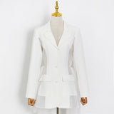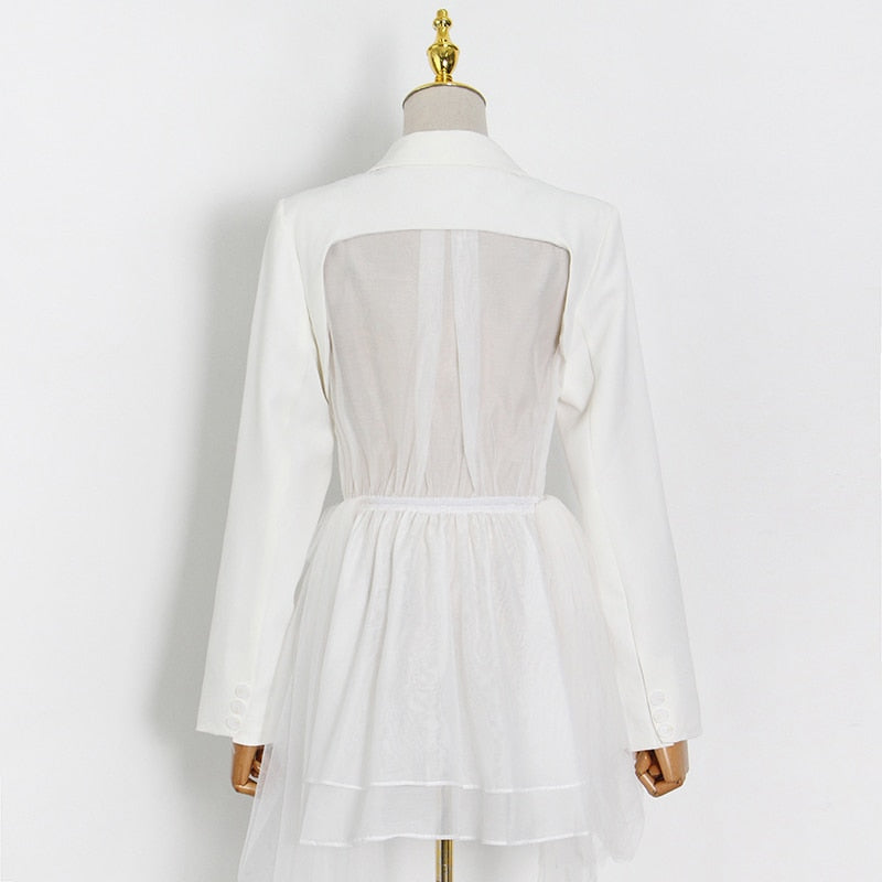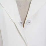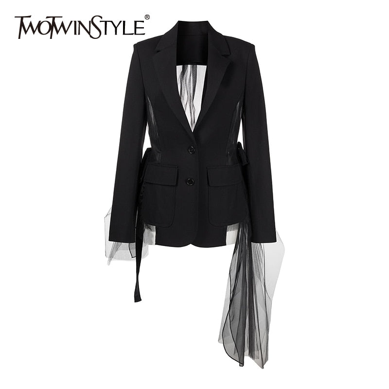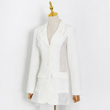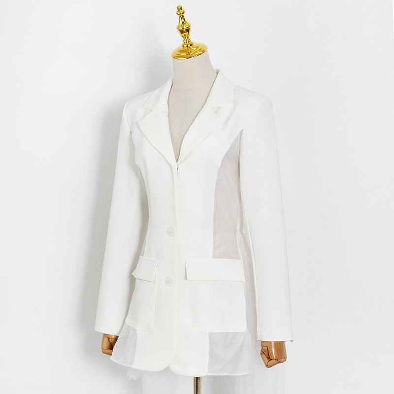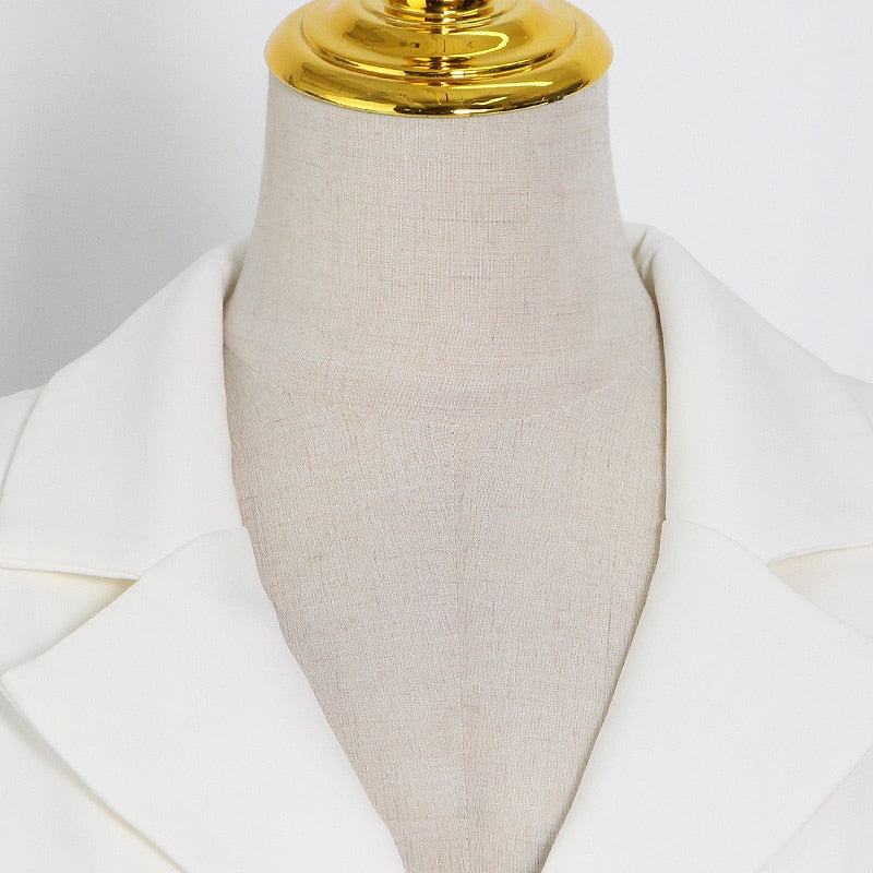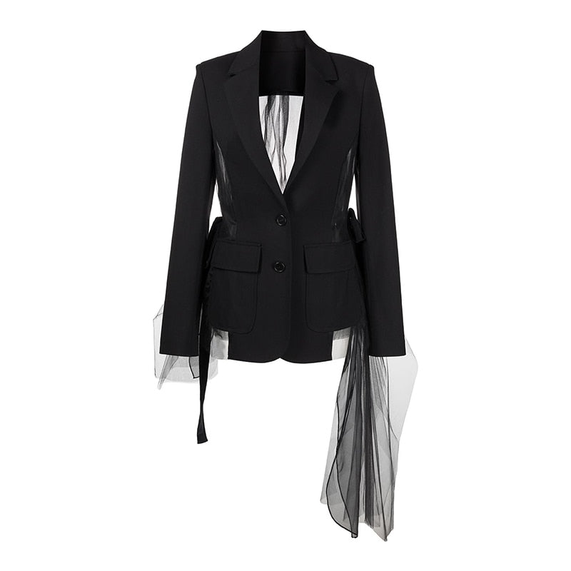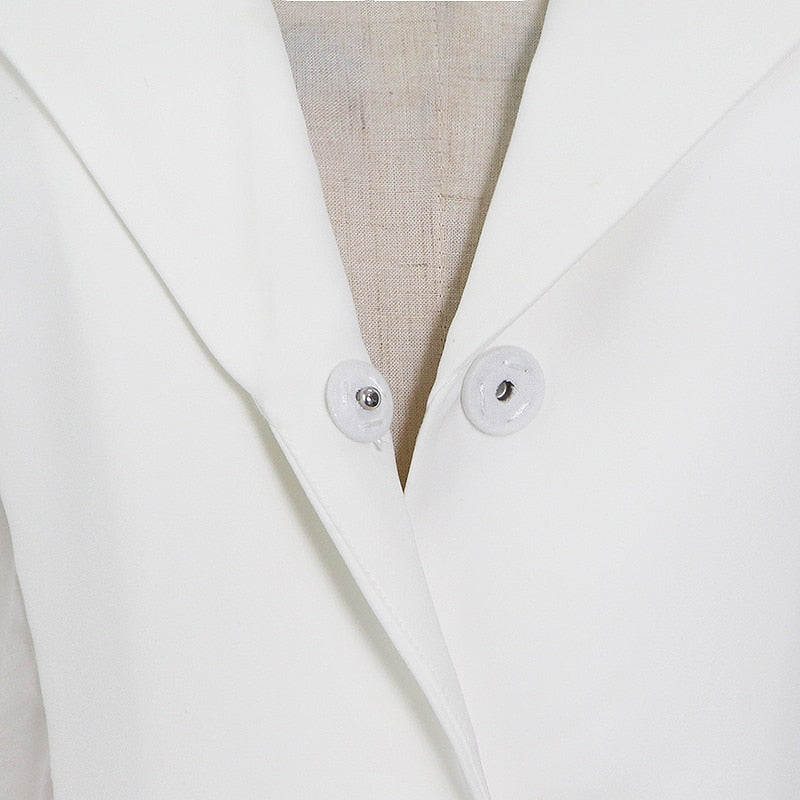 The classic and simple lines of this viscose blend single-breasted jacket are overturned by retro details. single-breasted blazer. Tight-fit, the concave shoulders and the large peak lapel remind of Bianca Jagger’s 70’s style. Jewel buttons fastening. Two flap pockets. lace gauze on the back.