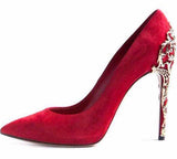 The iconic symbol of the Maison is the key feature of these suede pumps. This version is indeed “skewered” on the suede lined stiletto heel. Metal decorations all over the heel. Genuine leather sole. Inner lining. Heel: 120 mm.