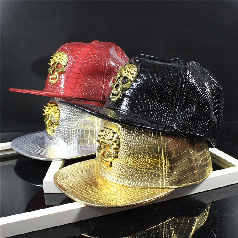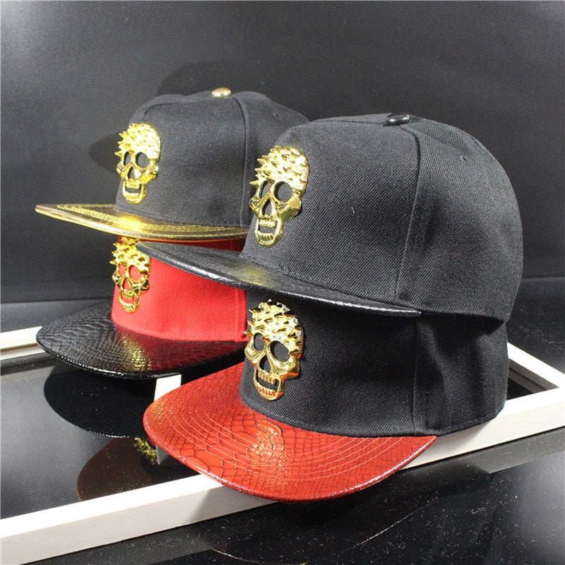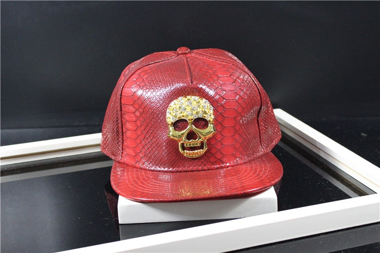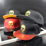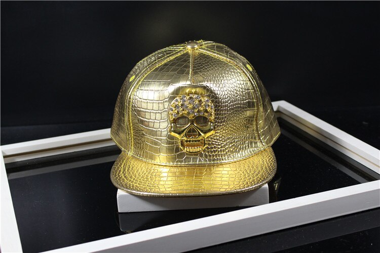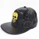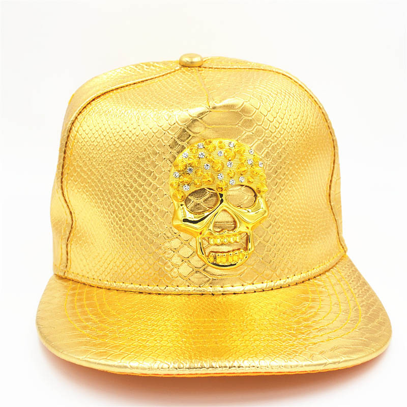 Cotton gabardine baseball cap with a golden skull embroidered on the front. Buckle adjusting strap. Unlined.