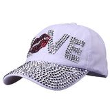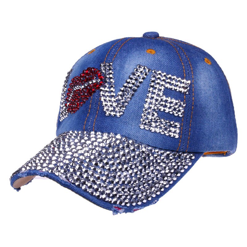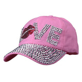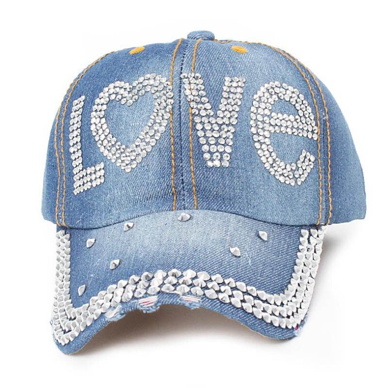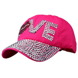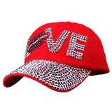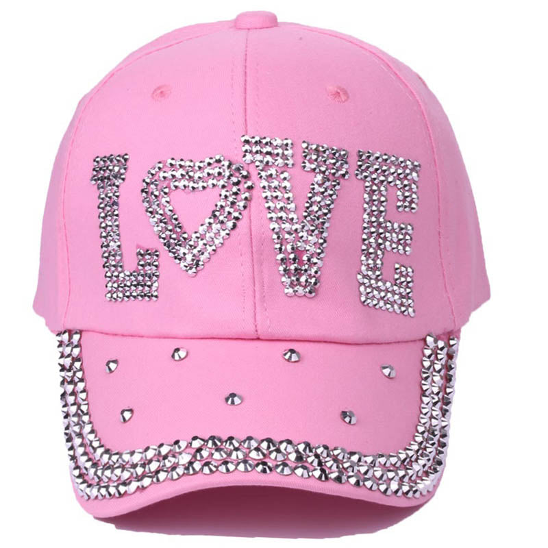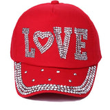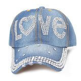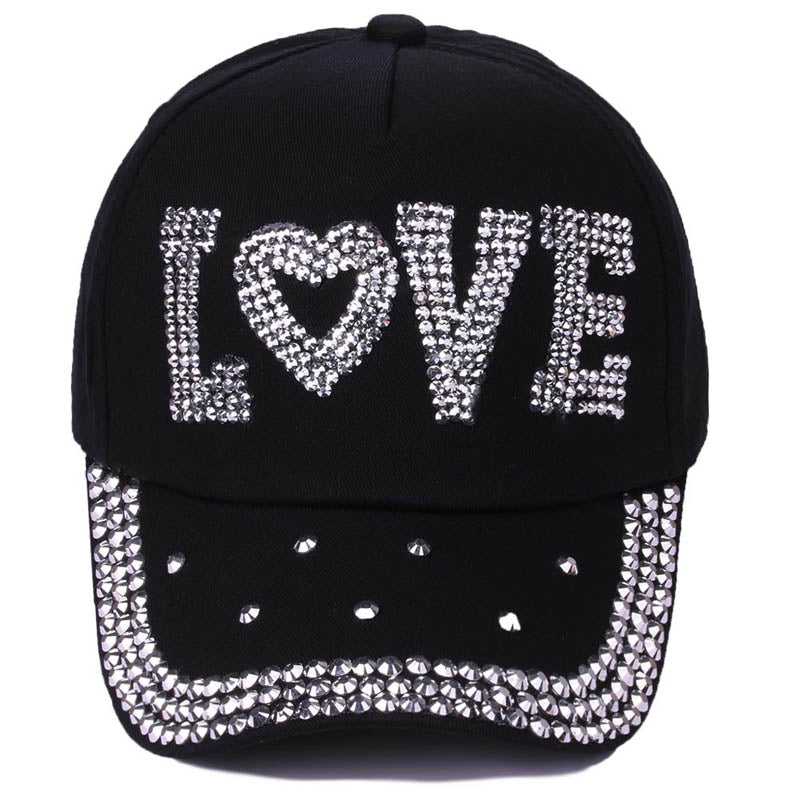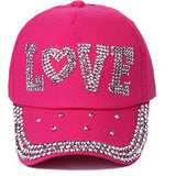 Cotton gabardine baseball cap with LOVE shape crystals embroidered on the front. Buckle adjusting strap. Unlined.