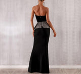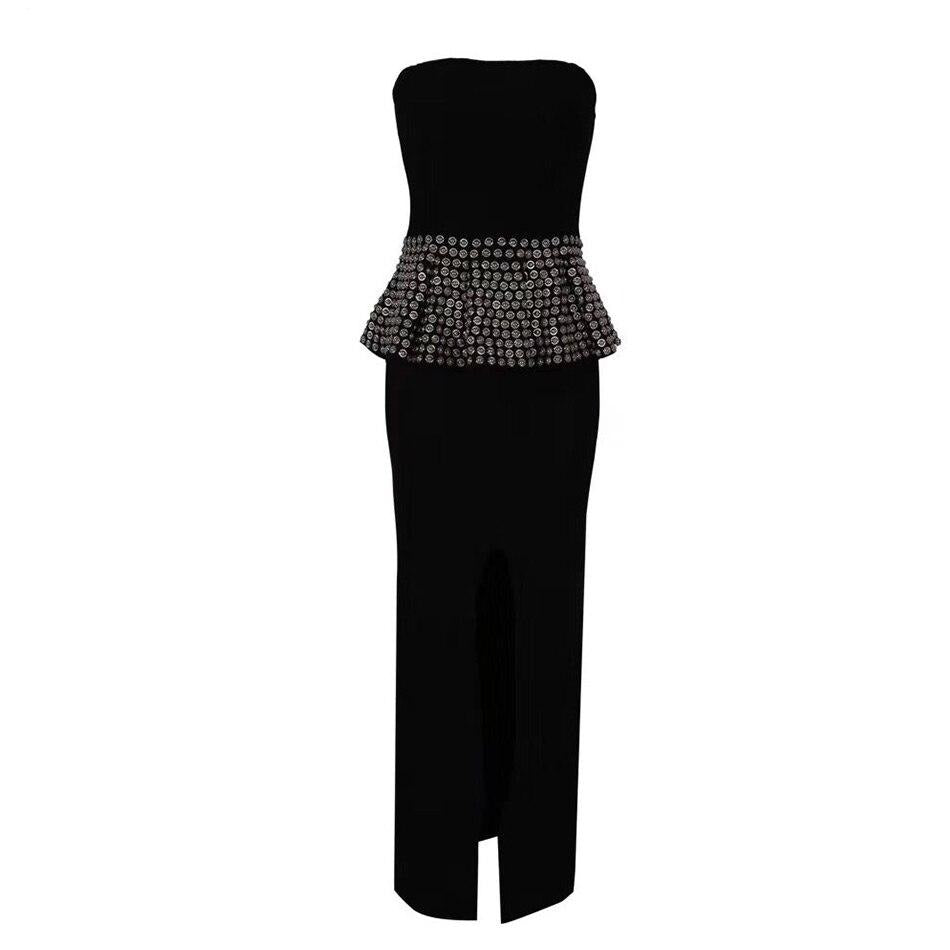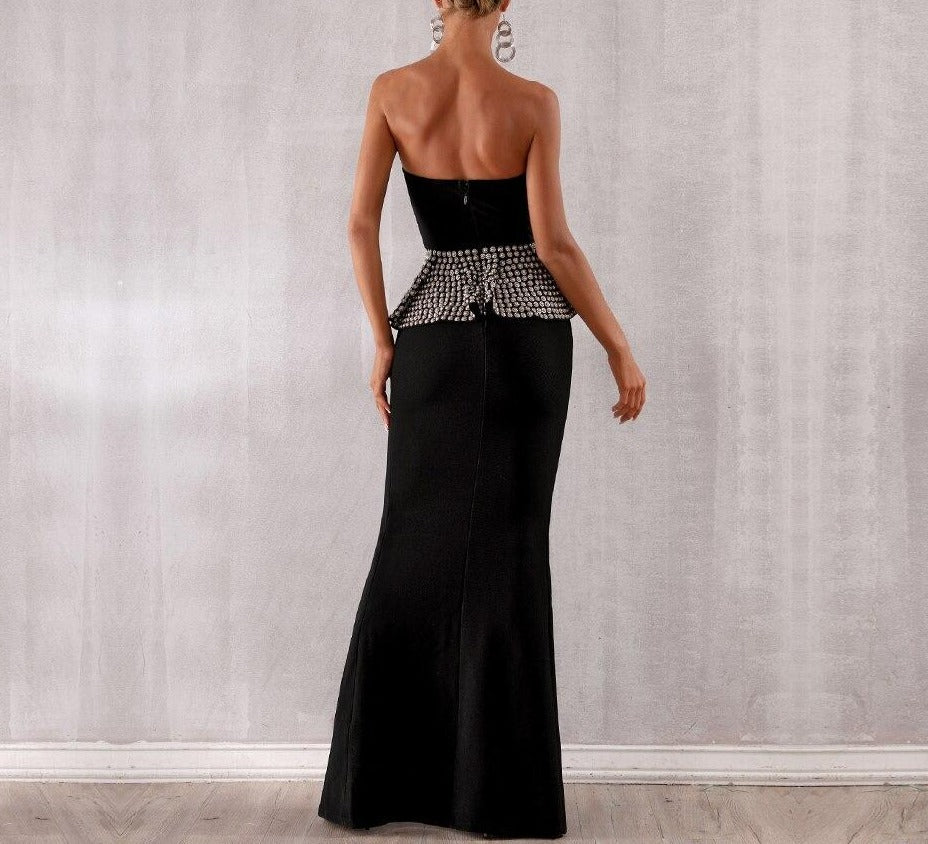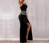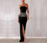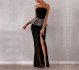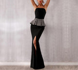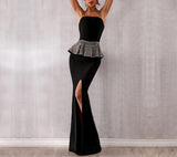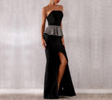 The 70’s glam is brought back by this silk cady long open shoulder dress. Dress is covered at the waistline with pleated drapes of contrasting colour. Thigh high slit on the left leg. Zipper fastening at centre back.