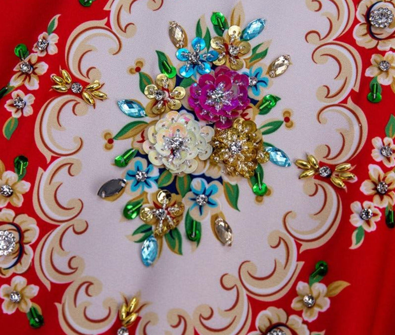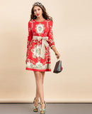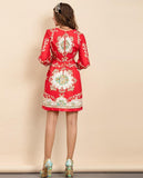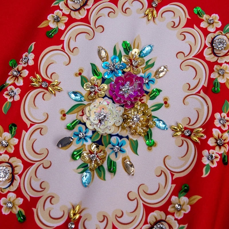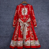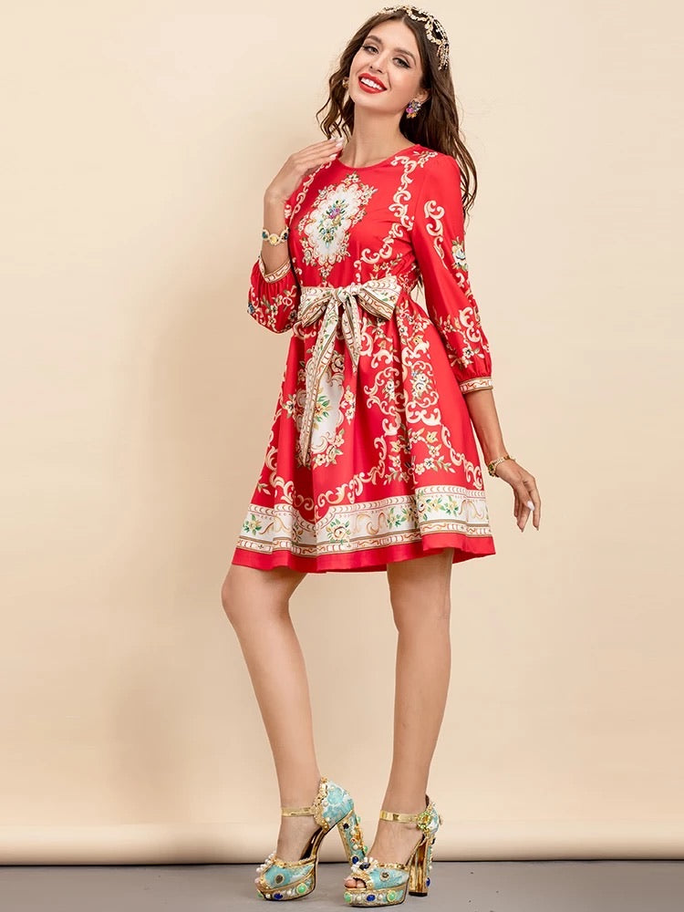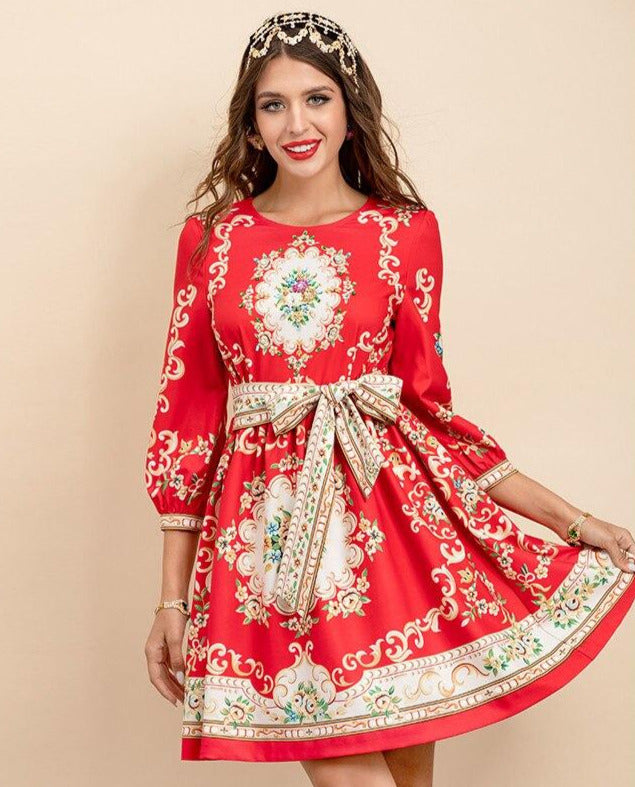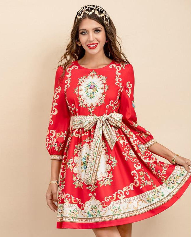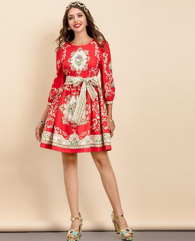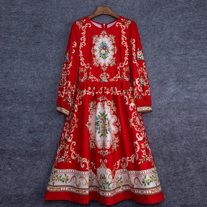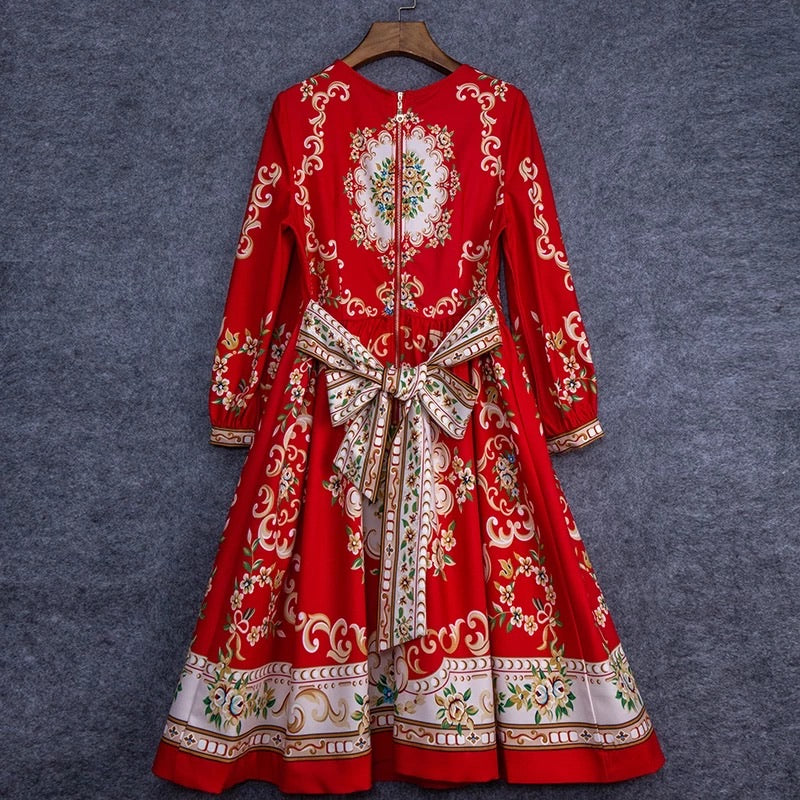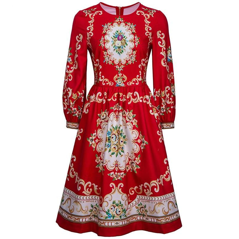 Sicilian-print Cotton jersey dress with long regular sleeves. The waist is highlighted by a ribbed decorated with white embroideries . The wide skirt gives volume to the garment. Concealed zipper fastening at centre back.