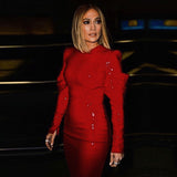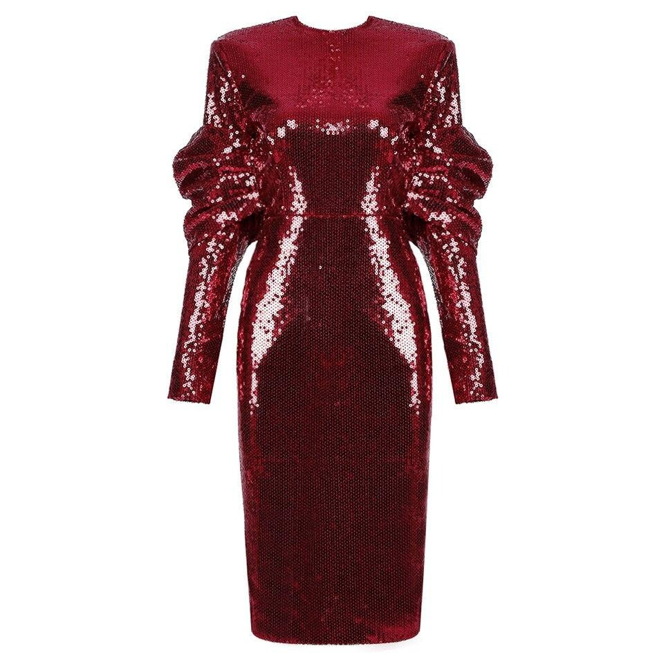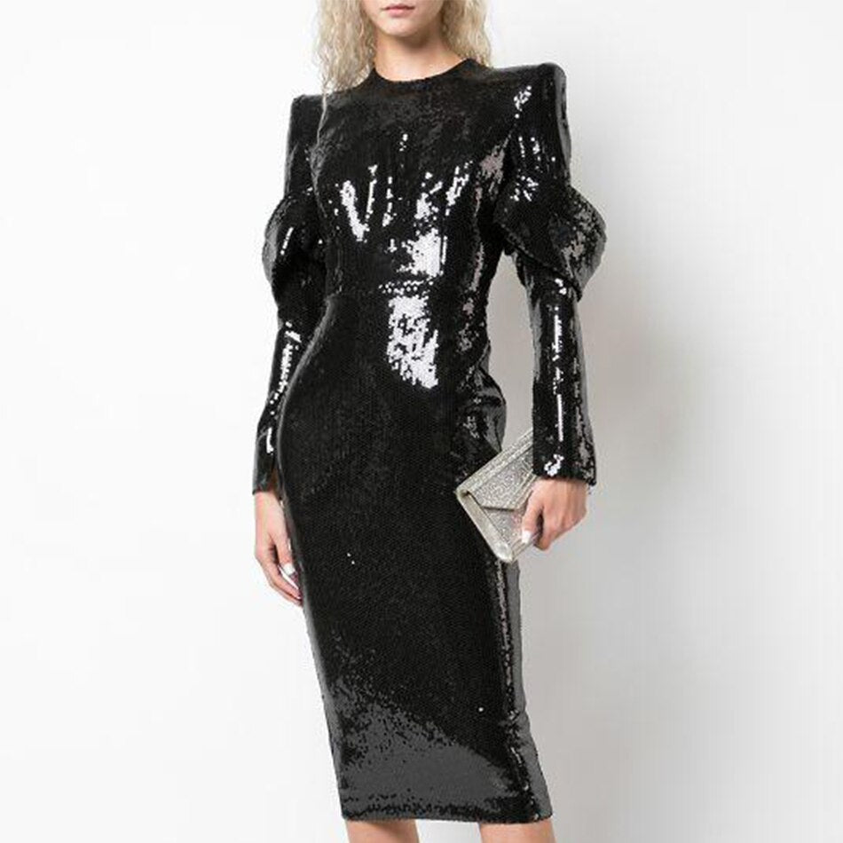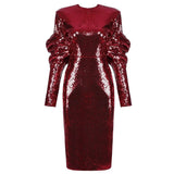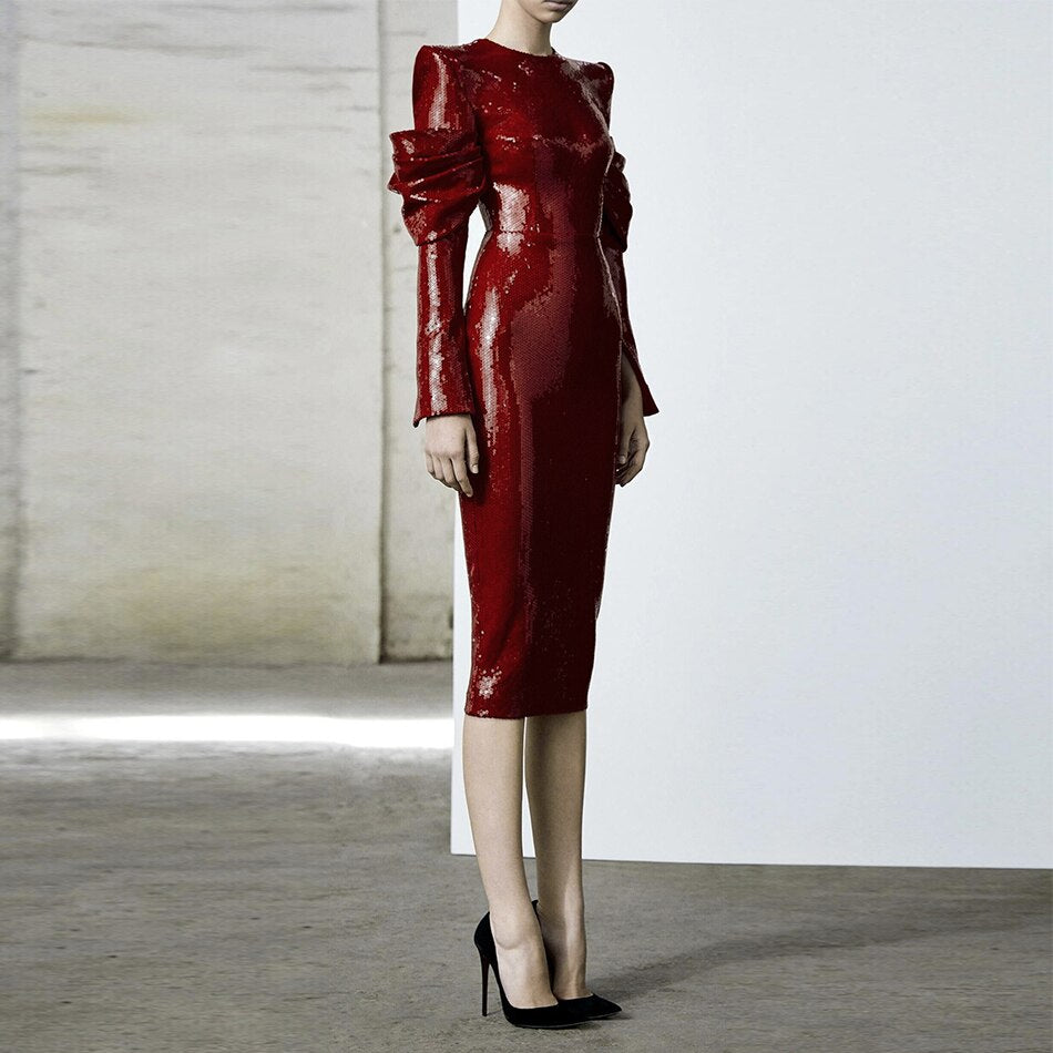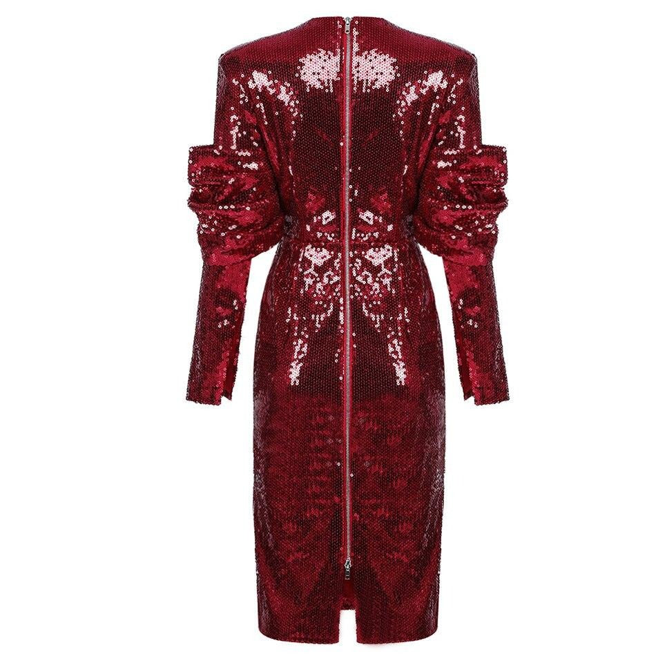Sequins encrusted dress. Puff sleeves are highlighted by shoulder paddings. The plunging V-neck ends with a draping that defines body and skirt. Small jewel buttons on cuffs. Concealed zipper fastening at centre back. Inner lining.