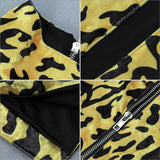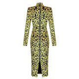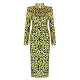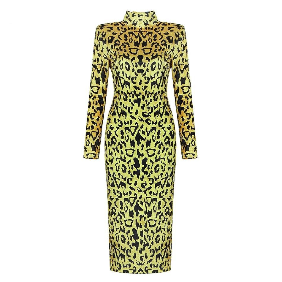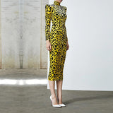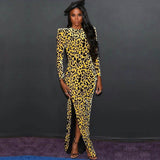 Leopard printed long evening dress. Turtleneck style . The elastic material highlights the waist. Draped on the centre back and a low back slit. Concealed zipper fastening at centre back. Dappled-print inner lining.