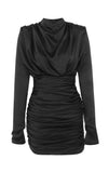 Tulle dress. Puff sleeves are highlighted by shoulder paddings. The plunging V-neck totally absent the dress ends with a draping that defines body and skirt. Small jewel buttons on cuffs. Concealed zipper fastening at centre back. Inner lining.