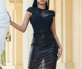 The simple, plain lines of this sheath dress are brightened up by the tribute Pisani Maura pays to Starwars, the iconic George Lucas's movie. The garment is made of viscose knit yarn and is decorated with sequins woven in lurex throughout. The hexagonal logo is sewn on the left front bottom of the skirt.