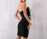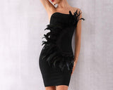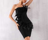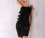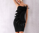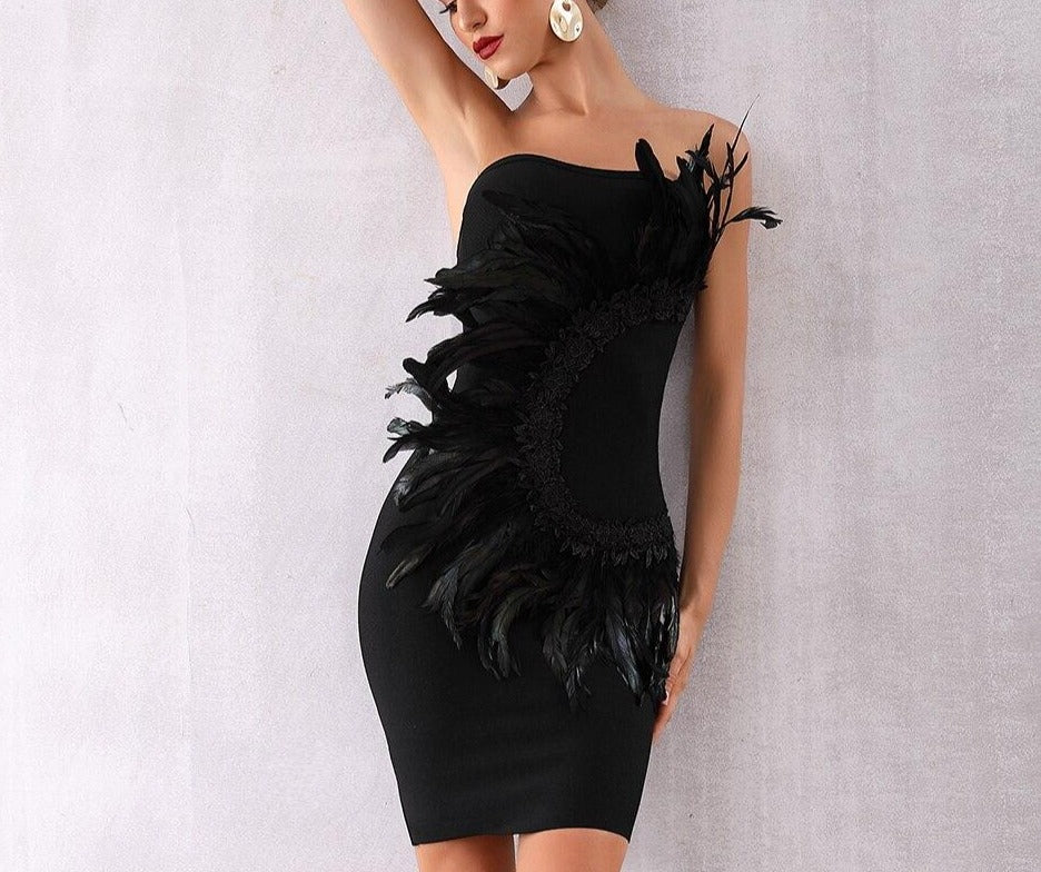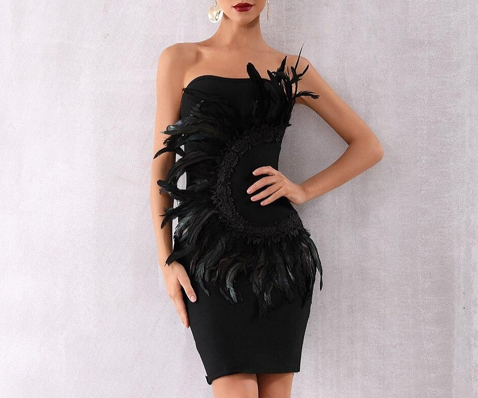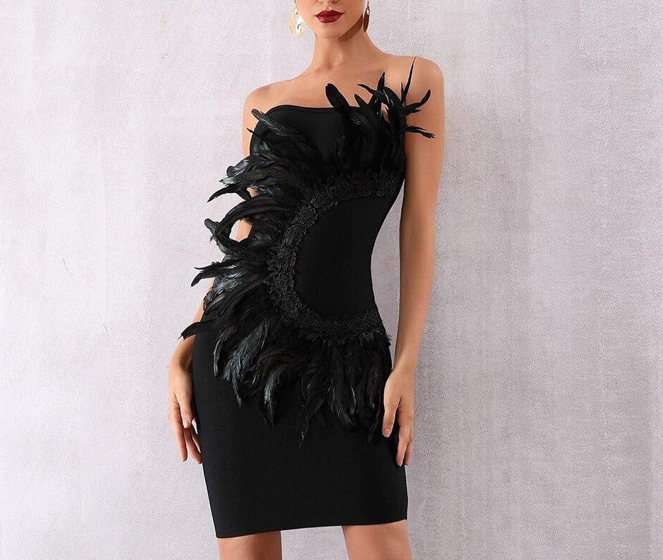 The 1970’s glam is featured on this feathers-covered dress. Plunge back and hook fastening neckband. Tight fitting bodice and soft and wide skirt. Zipper fastening at centre back.