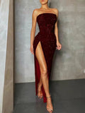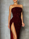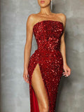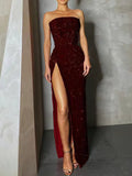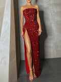 Dappled long evening sleeveless halter dress with Hollowed and straight drape at low neckline. The waist is highlighted by an engulfing tight design. Straight skirt with a high side slit. Concealed zipper fastening at centre back. Body lining. Sequin encrusted all over.