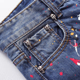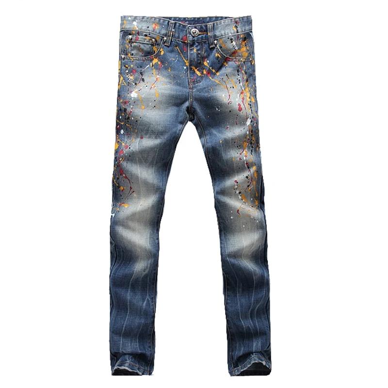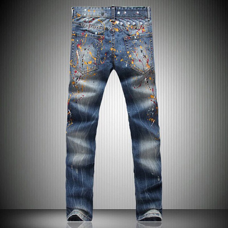 One of the features of these stone washed stretch denim 6 pocket pants are rips and scratches. Pollock-inspired drippings decorate the garment throughout. Single metal button at waist. A leather badge with the brand's hexagonal logo is sewn on the right rear pocket. Two needle stitching. Fit: Straight Supreme.
