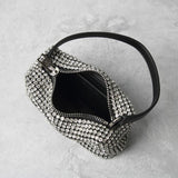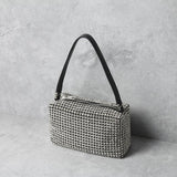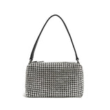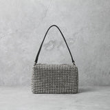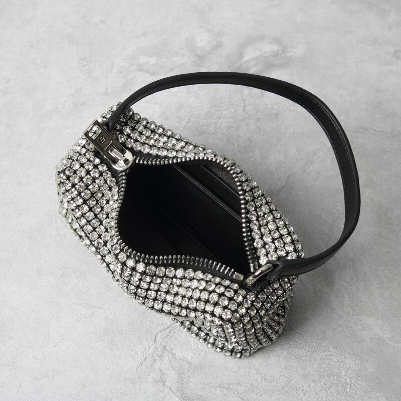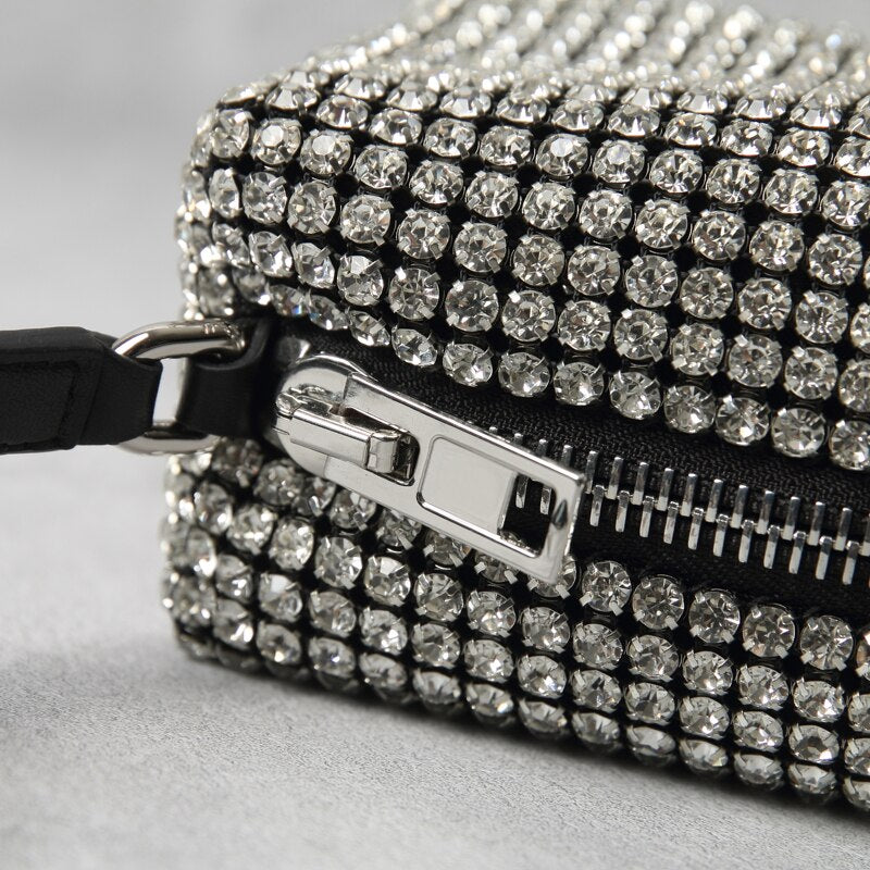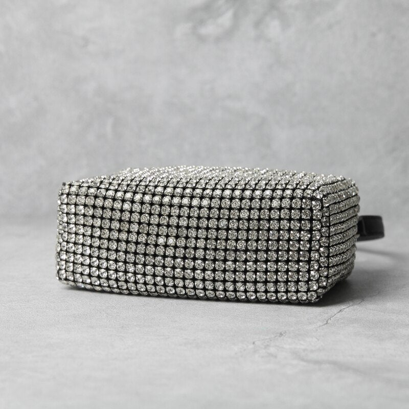 The Maison's dark elegance is the key feature of this genuine calfskin small clutch with rotating metal closure on the top. It has a detachable leather shoulder strap. The inside is fully lined and features a mirror and a ""You look great today"" embroidery. Fully emcrusted with swarovski stones. Measures: h cm 17, w cm 10, d cm 7.