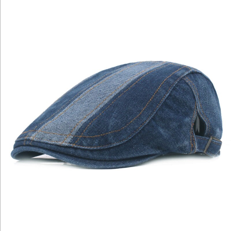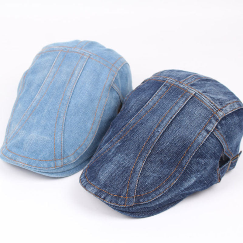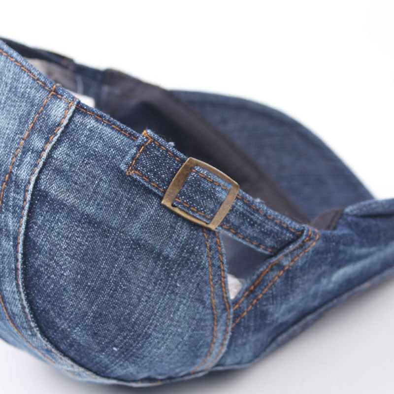 Denim beret cap. Buckle adjusting strap on the sides. Lined.