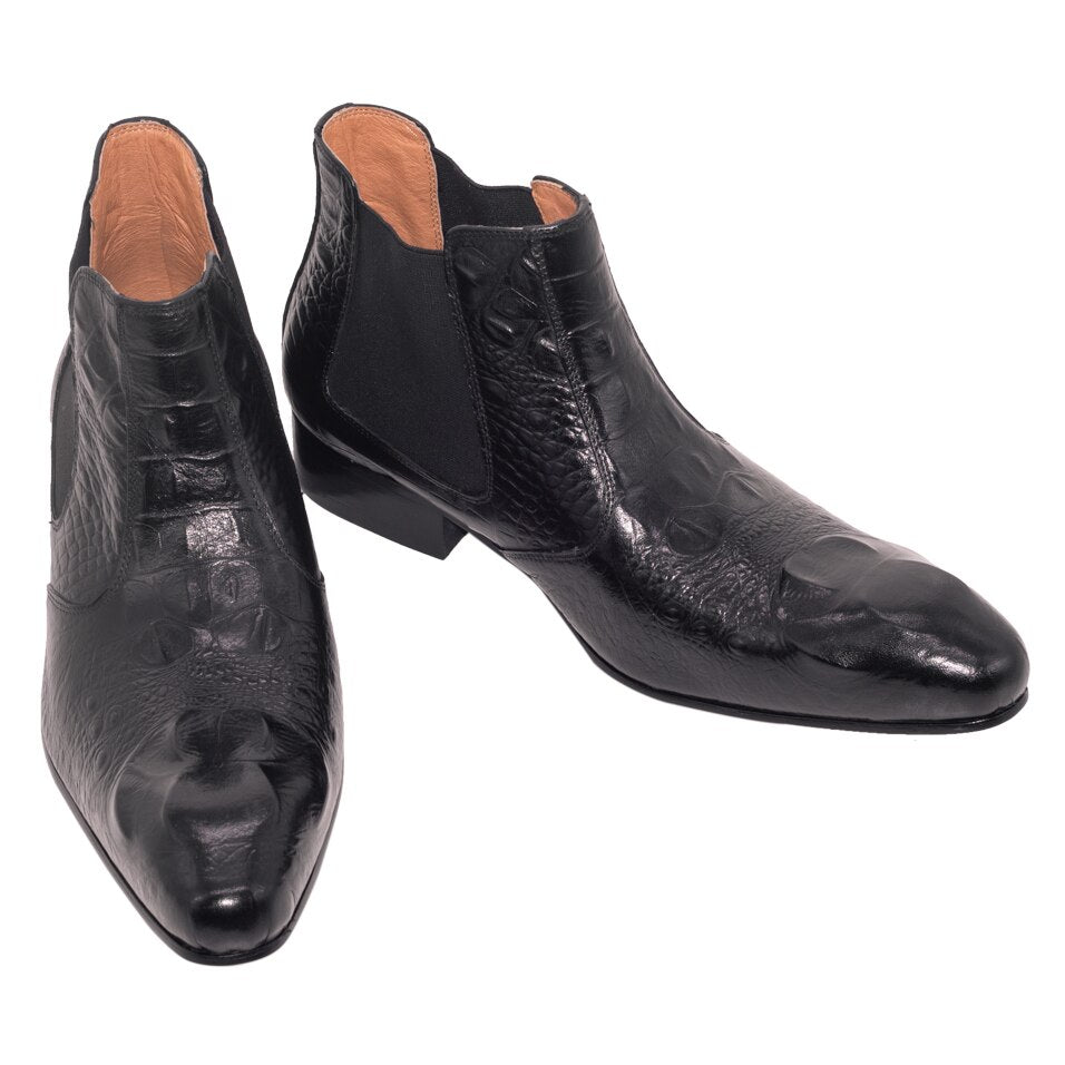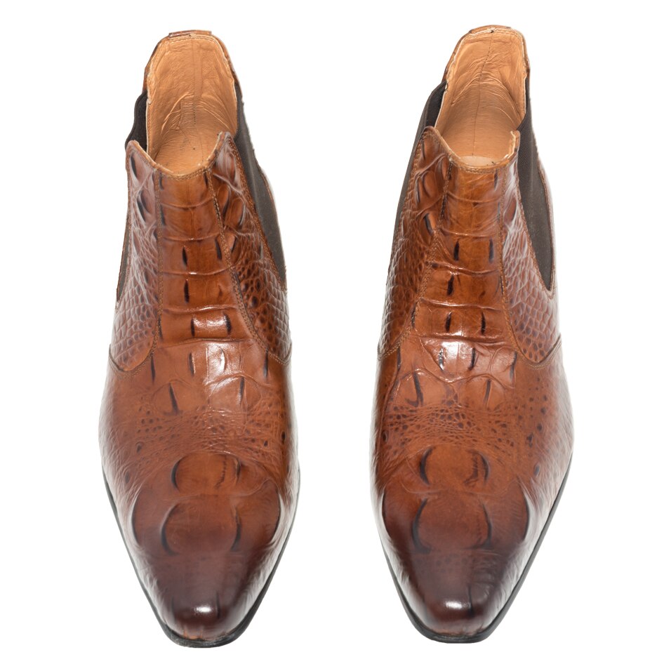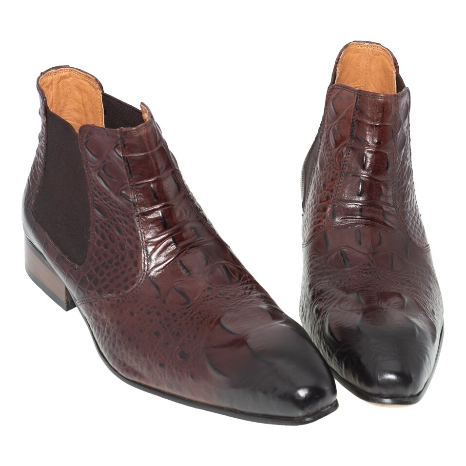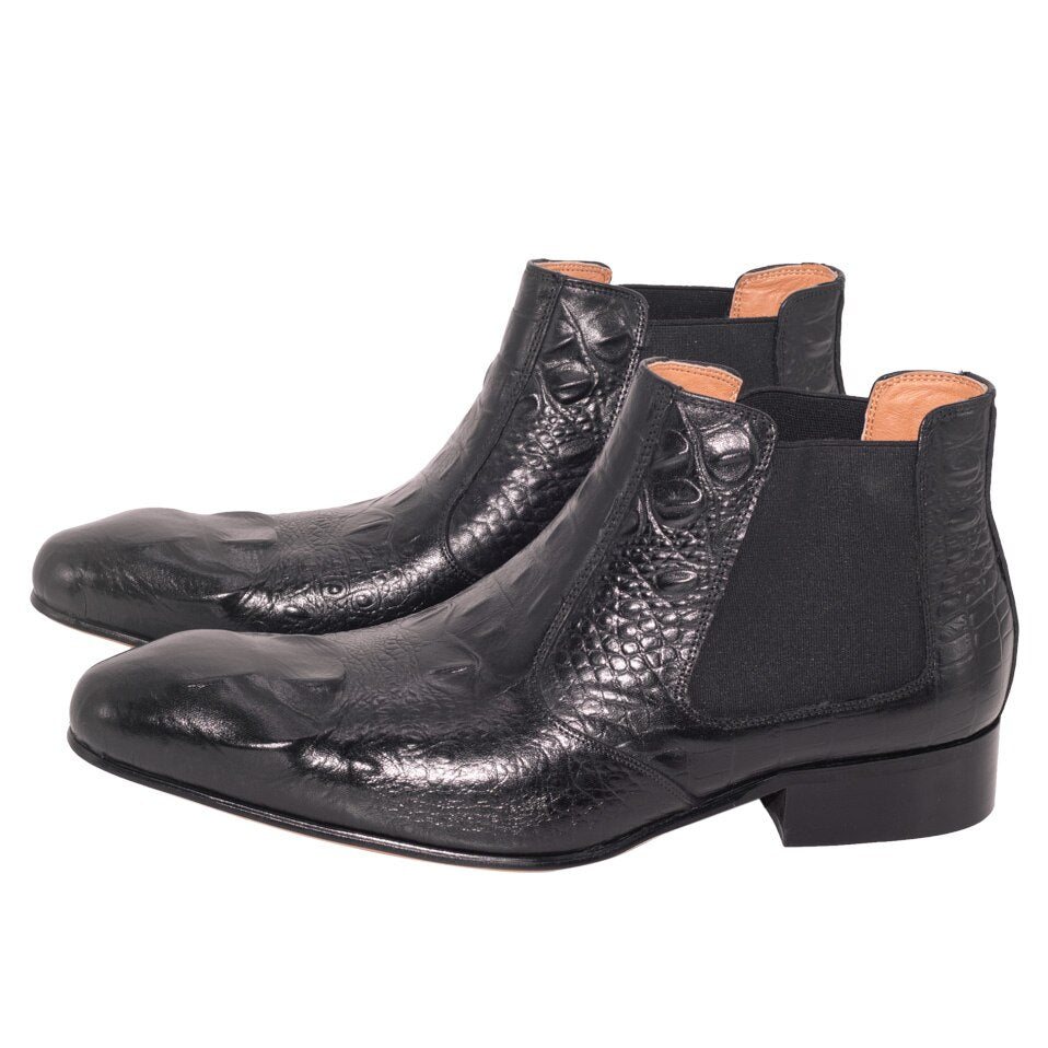 These calfskin ankle boots feature ankle elastic strap. Side elastic fastening. Metal badge on the heel. Leather sole. Leather lining.Crocodile embossed genuine leather.