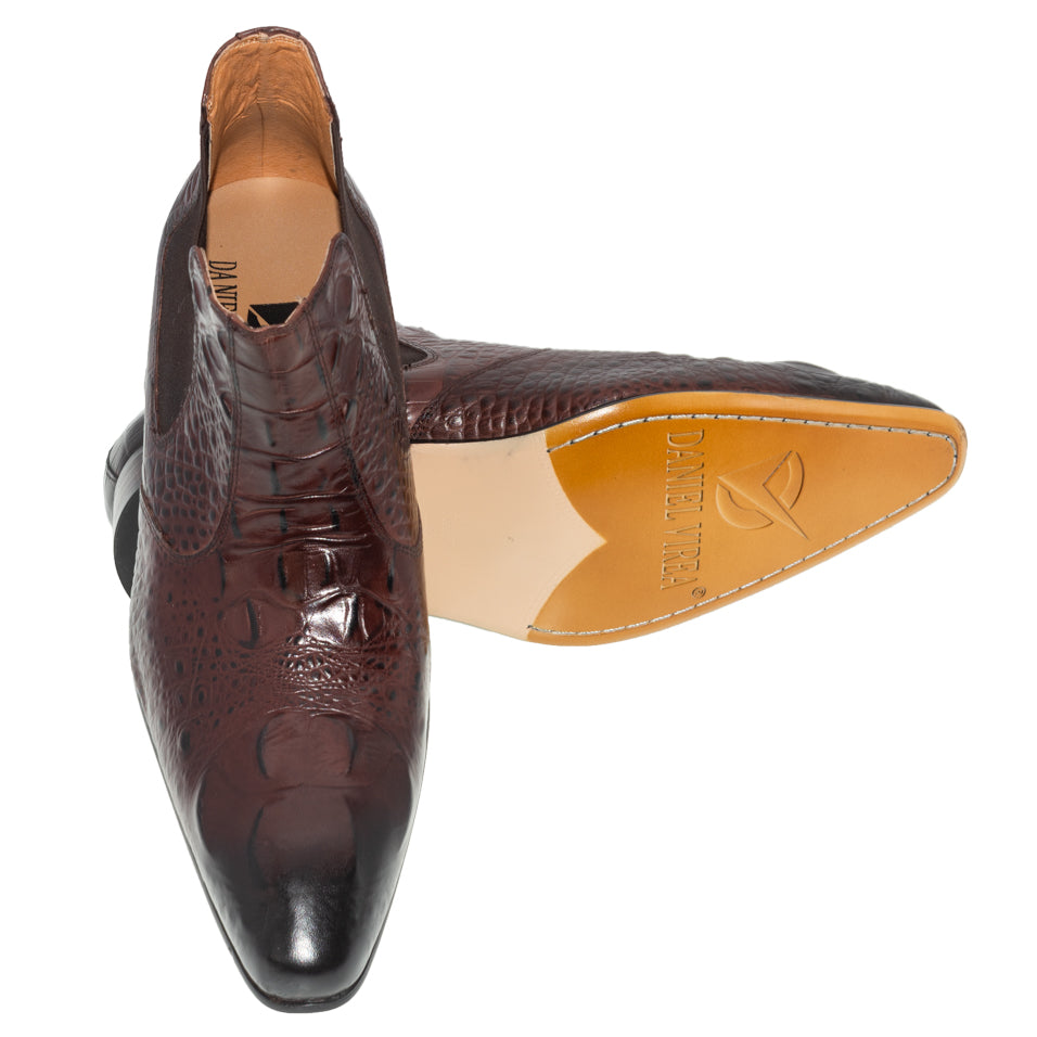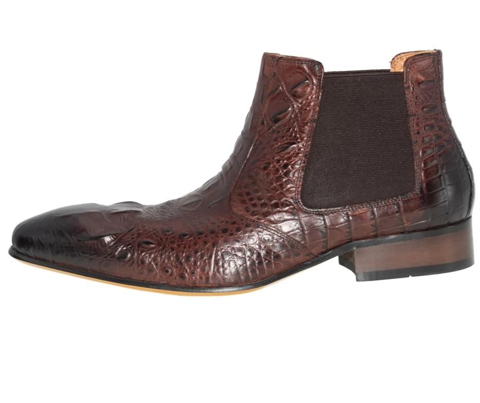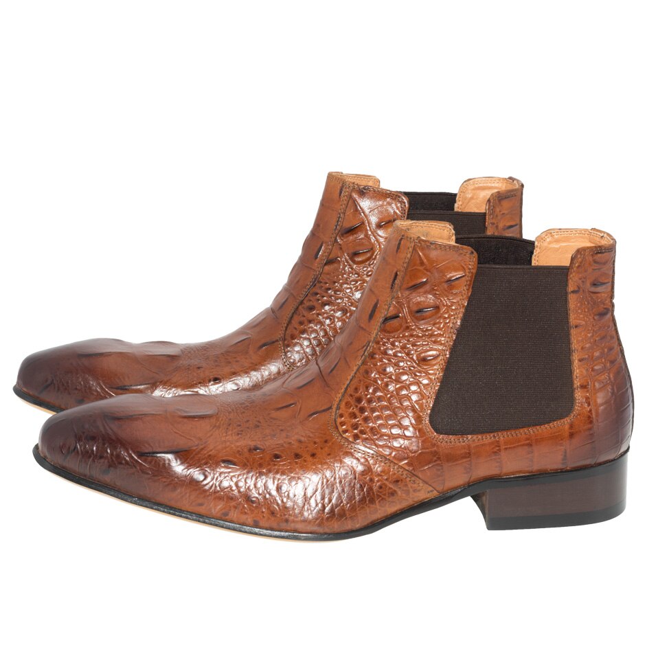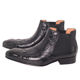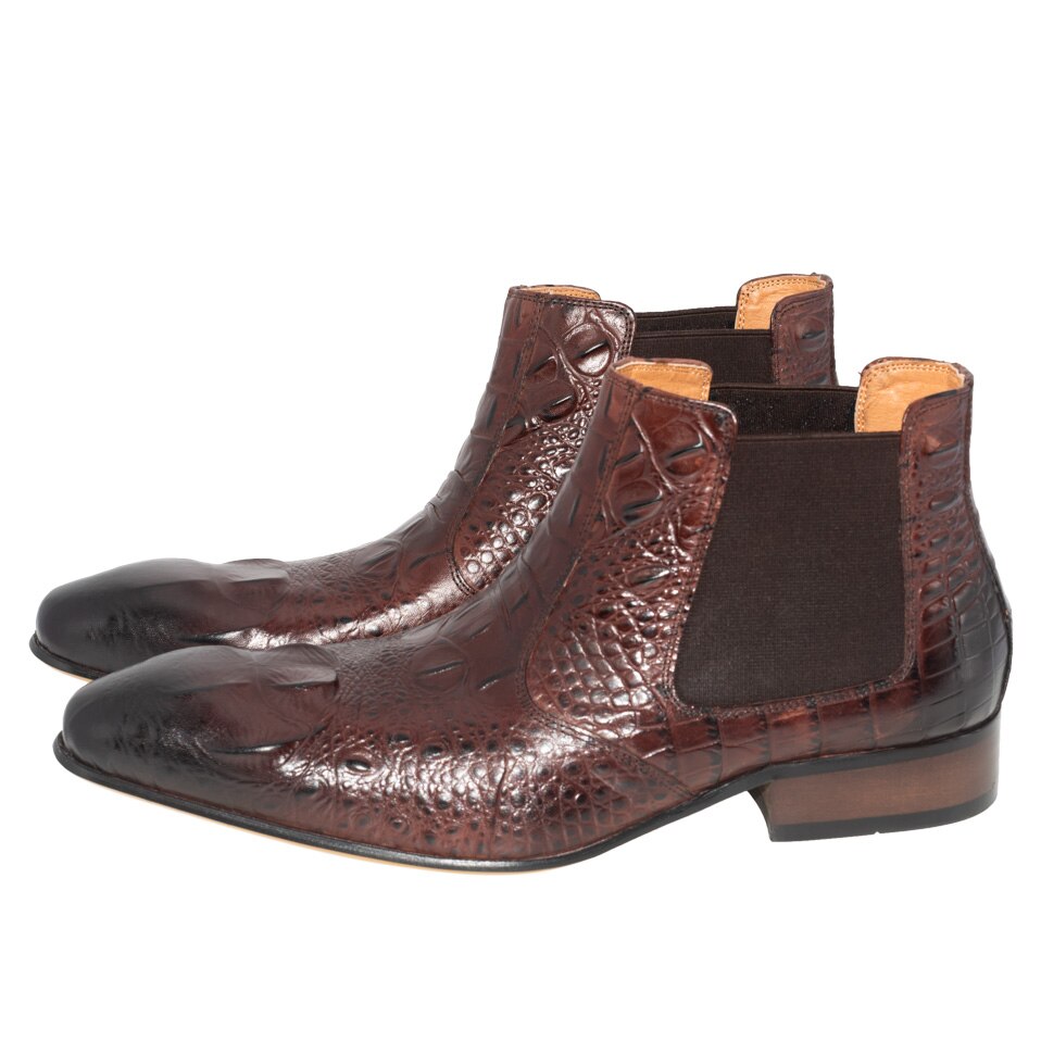 These calfskin ankle boots feature ankle elastic strap. Side elastic fastening. Metal badge on the heel. Leather sole. Leather lining.Crocodile embossed genuine leather.