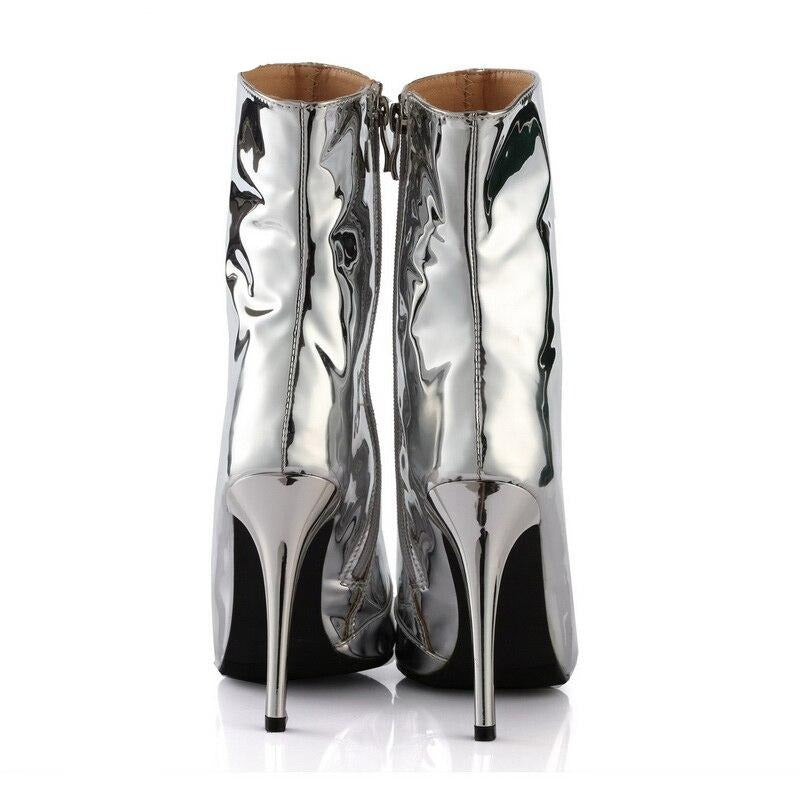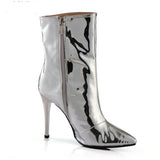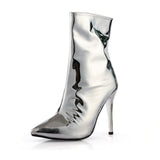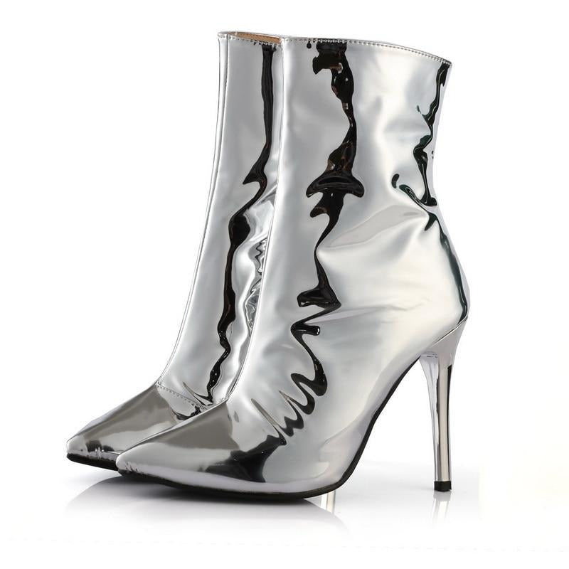 The Mirrors features an elongated silhouette that is entirely covered in black calfskin masterfully painted and raised on a 80mm heel. It adjusts with a delicate back zipper, leaving its audacious arch to reveal with each step the emblematic signature of the Maison Pisani.These nappa boots feature a leather silver or gold mirror finished colour. Zipper on the back. Iron stiletto heel. Nappa lining. Genuine leather sole. Heel: 80 mm.