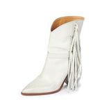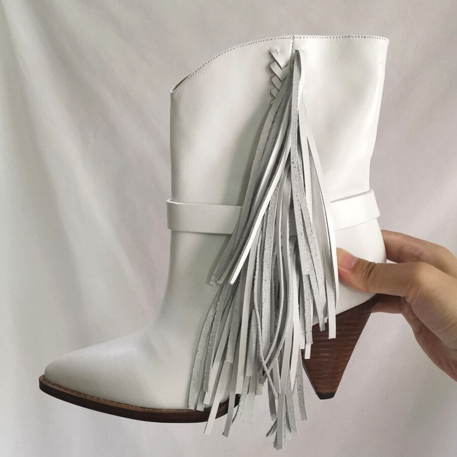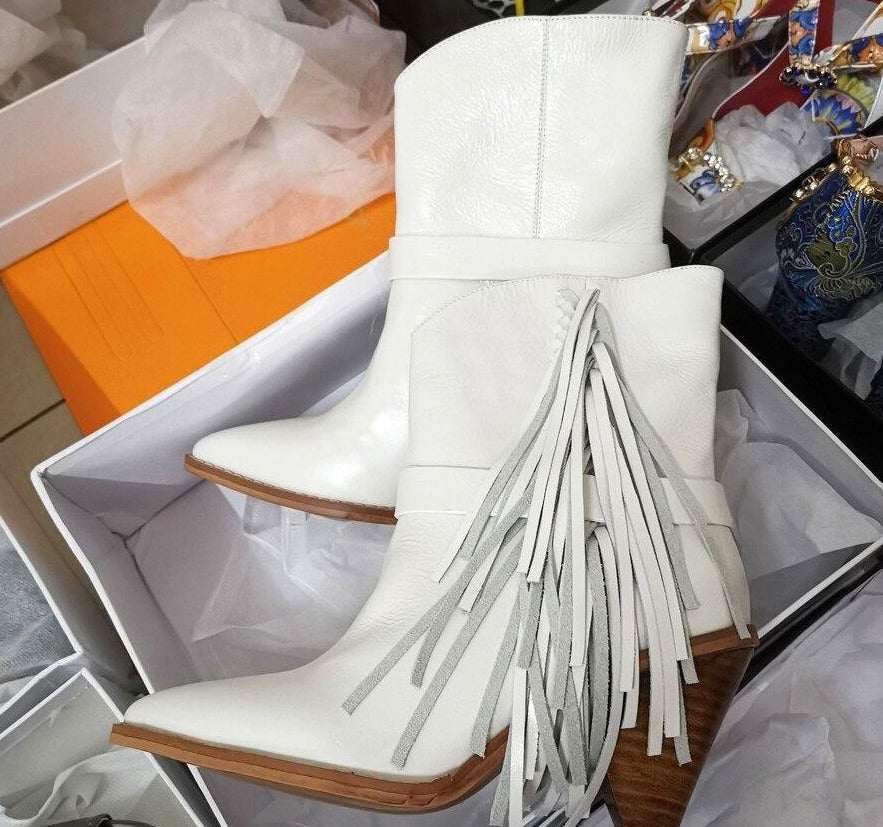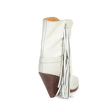 This season's theme, Far West, is the main feature of these leather ankle boots decorated with leather fringes. Genuine leather sole. Leather lining.