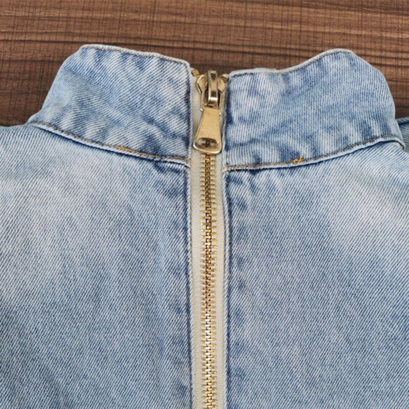 The ability to revise and innovate has always been maison Pisani main characteristics. This shirt proves just so. Large bowtie know on collar.long denim drapes coming down on front. Zipper fastener on the certre back.