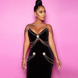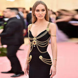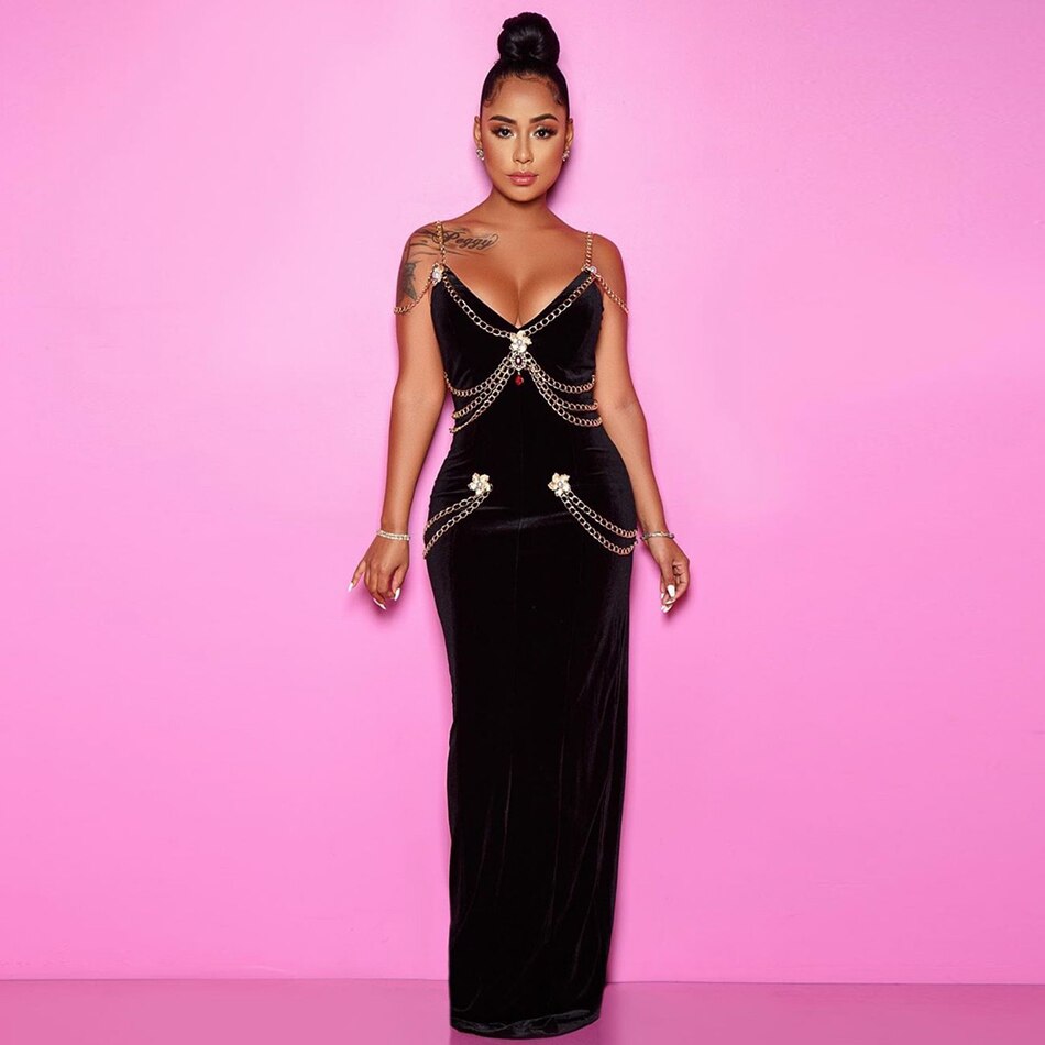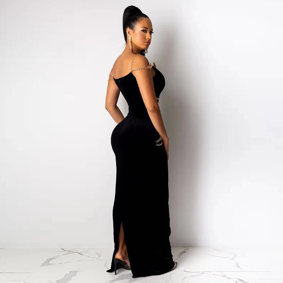 The 1980’s symmetries are back on this chained lurex and chiffon tank top shoulder long dress. A draping creates a deep neckline held at waist by a satin sash. The full skirt features a slit on the back of the leg. Zipper fastening on the side. Chians are attached to three jewels defining lines that would have normally been sawn.