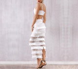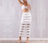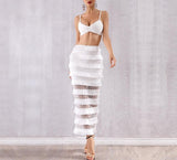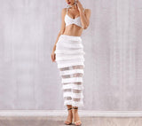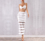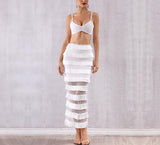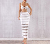 The simple lines of this tulle and viscose two-piece dress are brightened up by the the symmetrical look of the skirt. A plunge neckline defines this stretch halter dress covered in jacquard woven threads.Deep v-neck tank top top. Both the top and the skirt feature ribbed hems. The orizontal alternation of tulle bands and visone ones create a sailor dress effect taht demand attention.